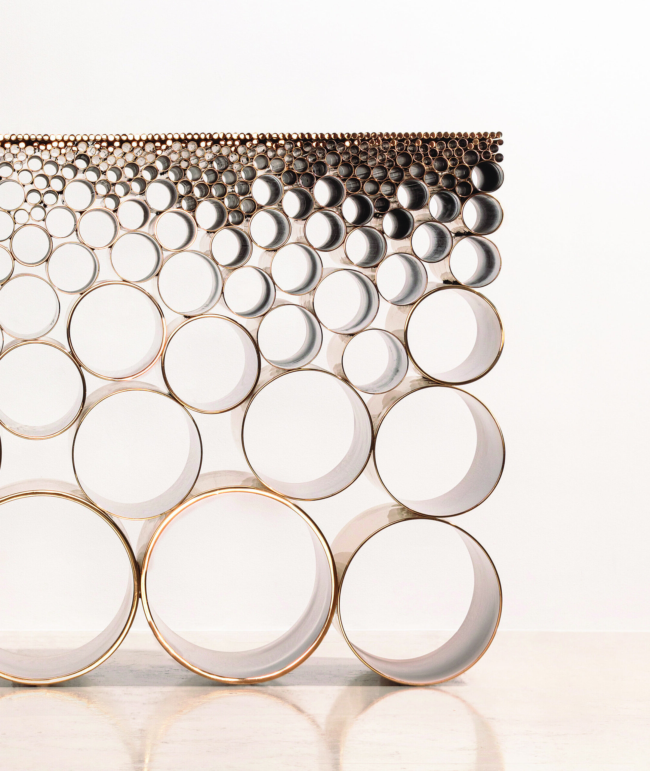 The Meditation console by Hervé Van der Straeten is an engineering feat. Made up entirely of stainless-steel tubes, it’s constructed so that just one incorrect placement would cause the table to lean or displace the flat top. The cylinders, which grow smaller and smaller as they bubble to the surface, artfully evoke a sense of motion in the static object. The illusion is a signature of Van der Straeten’s work, selections of which were displayed alongside the console at the designer’s Paris gallery on April 30, 2020. $99,000,