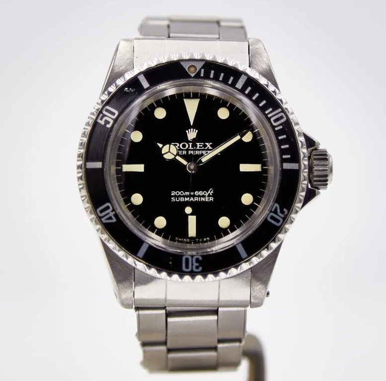 In the mid-1960s, during a time when Rolex was experimenting heavily with its coronet logo and wordmark, it produced a reference 5513 Submariner with a particularly quirky version. Made via a galvanic printing process that produced a yellowish hue, the coronet appears less defined than in other examples, and has since been named “Bart Simpson" by the collector community for its resemblance to the famed cartoon character’s head. A 5513 with such a coronet might carry roughly a 38% premium over a meters-first version with a more standard coronet.