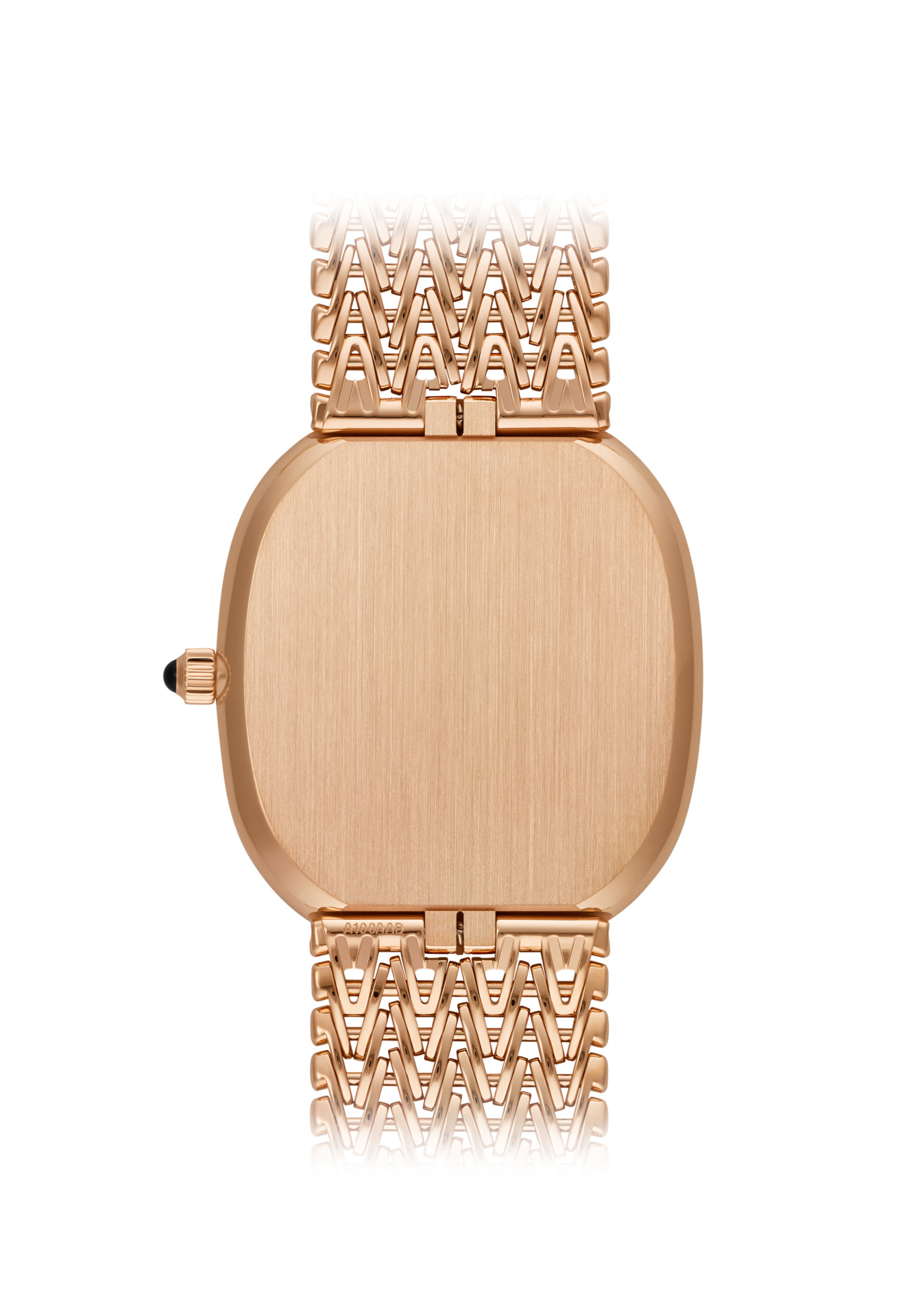 ‘Patek Philippe is revisiting this great era of horological design by proposing Reference 5738 on an elegant chain-style bracelet in rose gold that follows the contours of the wrist and offers superb comfort while also accentuating the finesse of the case. True to its continuous quest for innovation, the manufacture was intent on reinstating the chain bracelet in the collection, but eliminating the technical drawbacks associated with the previous versions, particularly with respect to adjusting the length. The product of 15 years’ development, the new bracelet in 18K rose gold, hand-polished throughout, is distinguished by its modern, patented construction, which made it possible to recreate the style of the classic chain bracelets. It comprises 363 parts, including more than 300 links, assembled manually one by one. The new bracelet is introduced as an exclusive feature of this Golden Ellipse Reference 5738/1R-001. Its modern construction allows the length to be adjusted more easily, whether shorter or longer. The clasp (its cover adorned with an engraved motif continuing that of the bracelet) offers the choice of three adjustment notches.