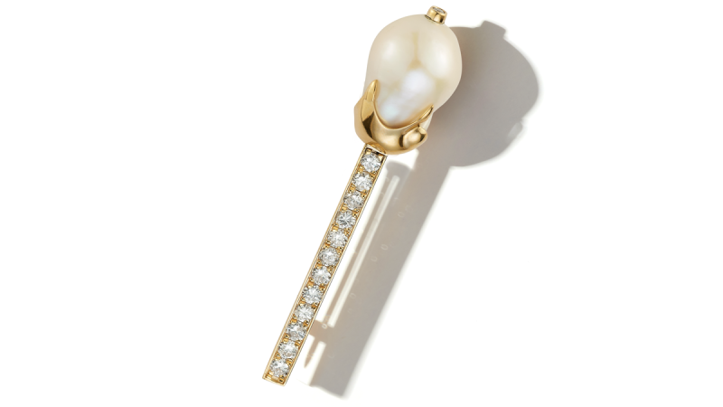 While stick pins might be considered the beginner option to a more advanced jeweled brooch, Mateo’s Scepter brooch in gold, diamonds and a single baroque pearl still makes for a bold statement.