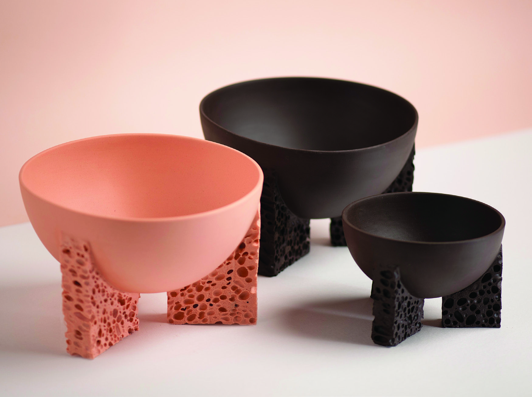 “แนวทางดั้งเดิมนั้นมักเกี่ยวกับการเรียนรู้เทคนิคโบราณอย่างละเอียด" Iain Howlett กล่าว ครึ่งหนึ่งของ Studio Furthermore ตั้งอยู่ในลอนดอน ร่วมกับ Marina Dragomirova “เราไม่ได้สนใจเรื่องนั้น" นักออกแบบเลือกใช้เส้นทางที่มีผู้คนสัญจรน้อย ในกรณีนี้พวกเขาหมายถึงฟองน้ำที่ถูกฉีดด้วยดินก่อนเผา เมื่อสารทำความสะอาดเผาไหม้ เซรามิกจะยังคงรักษารูปแบบออร์แกนิกเอาไว้และมาพร้อมกับช่องอากาศว่างๆ ผลลัพธ์ที่ได้คือการสร้างสรรค์ที่มีพื้นผิวที่เป็นเอกลักษณ์ของปะการังและหินไอซ์แลนด์ที่โดนสภาพอากาศ