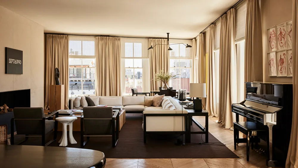 เพนท์เฮาส์แบบสามชั้นใน NoHo ประกอบด้วยพื้นไม้โอ๊คฝรั่งเศสลายซิกแซก หินธรรมชาติ เช่น หินปูนทรายและหินอ่อนคาร์ราราขัดผิว และรายละเอียดโลหะบรอนซ์เข้ม การออกแบบของ Van Duysen เน้นความเรียบง่ายด้วยสีสันที่ลดทอนลงมาจากธรรมชาติ
