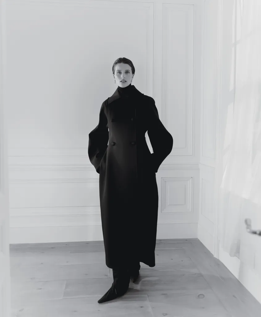 Jil Sander black cotton coat, black wool pants, and black calf-leather boots, all prices upon request;