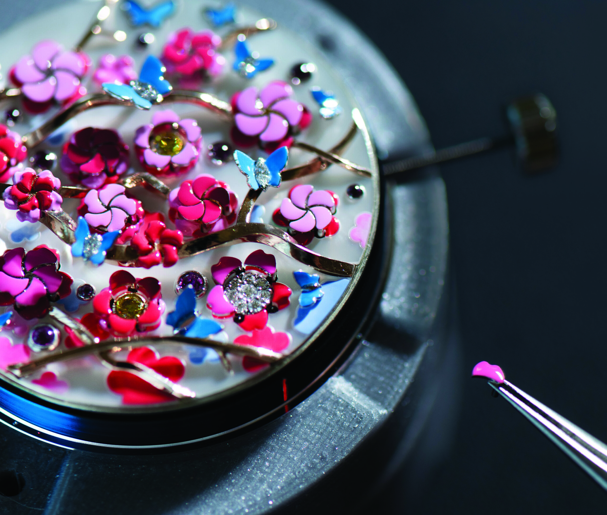 Van Cleef & Arpels ผสมผสานความเชี่ยวชาญด้านเทคนิคระดับสูงเข้ากับนาฬิกาอย่างมีวิจิตรศิลป์ และยังมีชื่อเสียงในด้านการสร้างโรงละคร คู่รักมาที่พบกันเพื่อจูบกันบนสะพาน บัลเลต์ และดาวเคราะห์ที่โคจรอยู่ กลายมาเป็นสัญลักษณ์ทางกาลเวลาของที่พักอาศัยในฝรั่งเศส และล่าสุด Lady Arpels Heures Florales และ Lady Arpels Heures Florales Cerisier ขนาด 38 มม. (prices upon request) นำเสนอนาฬิกาที่มาพร้อมกับหน้าปัดที่หลากหลายที่สุดในปัจจุบัน