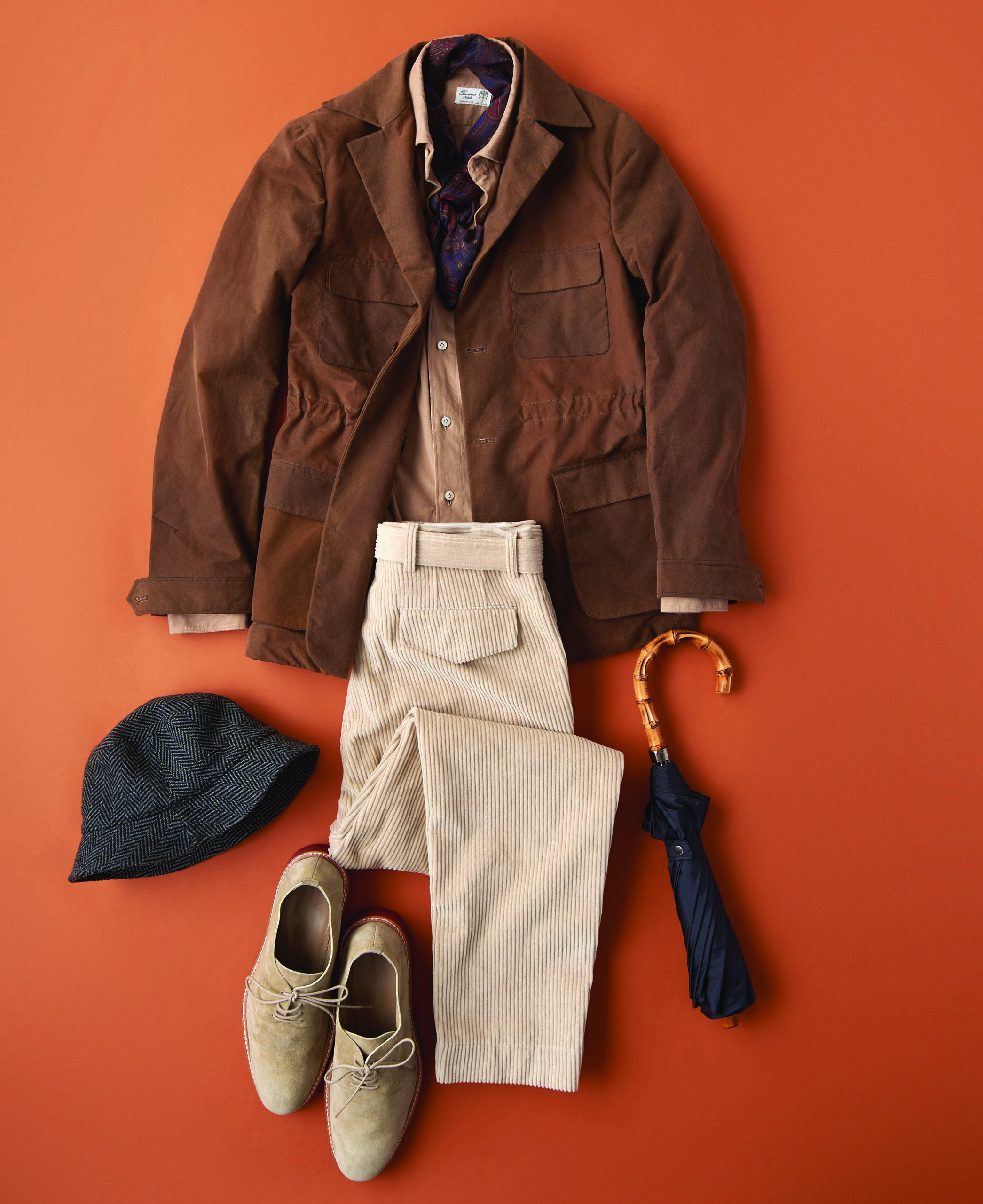 THE PLUSH LIFE Corduroy’s distinctive velvety texture instantly ups the luxe factor of any outfit. Here, the double-soft combination of a pinwale shirt with jumbo-wale trousers makes a hardy waxed jacket look urbane enough for the office.