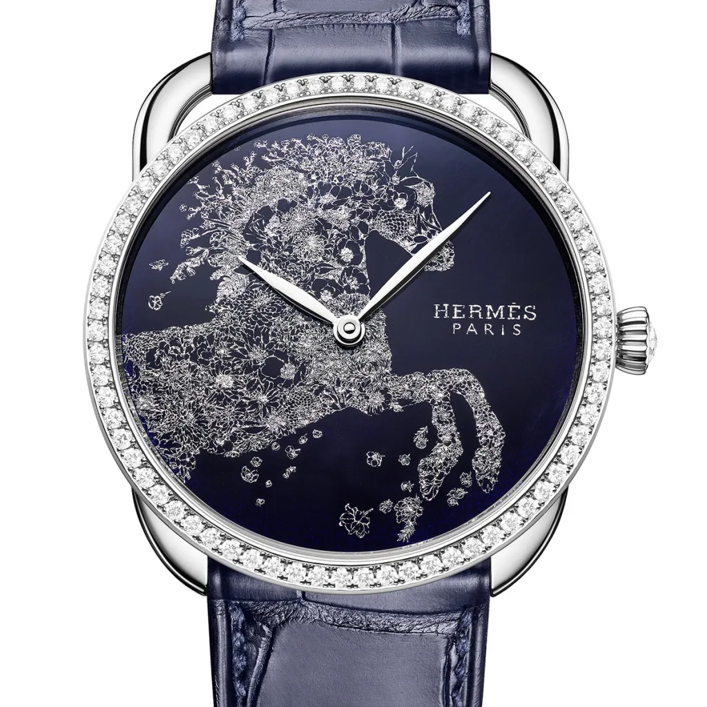 สิ่งที่ดูเหมือนการปักดิ้นที่ละเอียดอ่อน แท้จริงแล้วคือเส้นสายและประกายเงินอันละเอียดอ่อนที่อยู่ระหว่างชั้นของการเคลือบในสไตล์ paillonné แม้ว่านักออกแบบผ้าพันคอไหมชื่อเดียวกันอย่างศิลปินชาวฝรั่งเศส Théo de Gueltzl จะมีความสามารถ แต่การสร้างภาพนี้บนหน้าปัดนาฬิกาเป็นเรื่องที่แตกต่างไปจากการพิมพ์บนผ้าพันคออย่างสิ้นเชิง ในขณะที่ผ้าพันคอเป็นเรื่องของสีสันหลายสี บนหน้าปัด เงินโดดเด่นเป็นโล่ง ๆ ท่ามกลางพื้นหลังสีน้ำเงินเข้ม รุ่นประดับเพชรโรสโกลด์ ราคา $90,000 และรุ่นประดับเพชรทองขาว ราคา $95,500 ผลิตจำนวนจำกัด 24 เรือนต่อรุ่นเท่า
