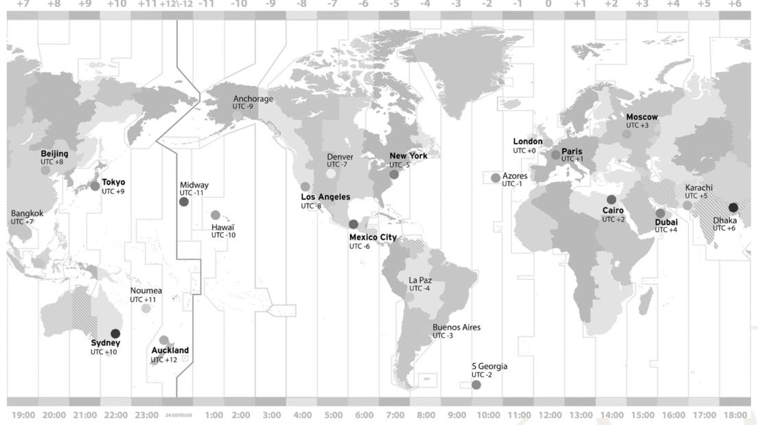 เป็นเวลานานมากแล้วที่ทุกประเทศหรือทุกเมืองแสดงเวลาท้องถิ่นของตัวเองโดยขึ้นอยู่กับเส้นลองติจูด ในขณะที่นัก เดินทางต้องปรับการแสดงผลบนนาฬิกาของตัวเองโดยตลอด แต่ในยุคแห่งการเติบโตที่รวดเร็วของการเดินทางและ การสื่อสารที่นำไปสู่ความต้องการในการรวมระบบเวลาเข้าด้วยกัน เมื่อปี 1884 ในงานประชุม International Meridian Conference ที่กรุงวอชิงตัน ได้มีการตัดสินใจแบ่งโลกออกเป็น 24 โซน ที่ทุกๆ 15 องศาลองติจูด (เวลา 1 ชั่วโมง) และให้ใช้จุดอ้างอิง (ลองติจูดศูนย์) เป็นเส้นเมริเดียนแรก ซึ่งนักเดินเรือได้ใช้แนวทางนี้แล้ว