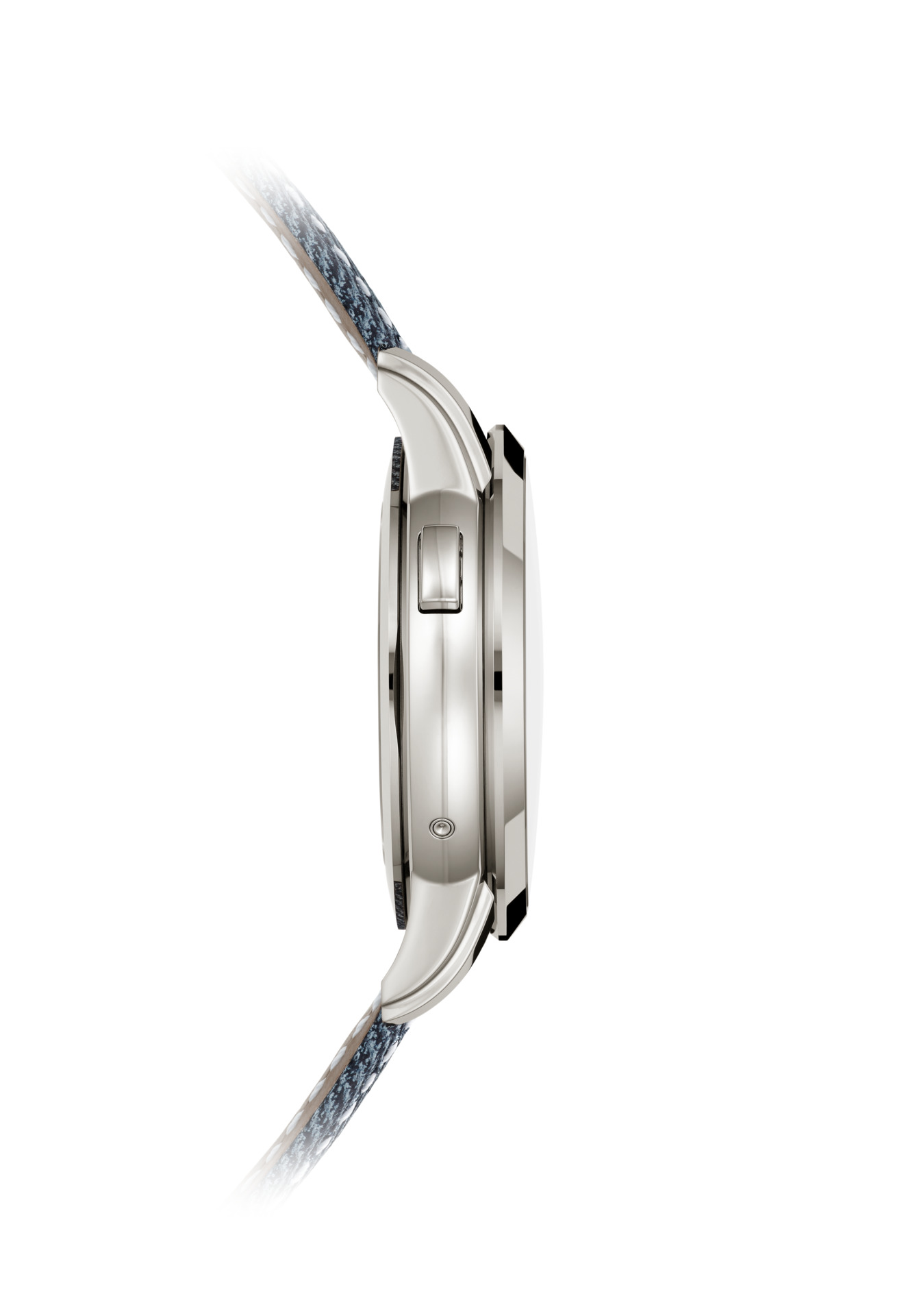 A calfskin strap embossed with a denim motif, in blue gray with white hand-stitching, echoes the color of the dial. It is secured by a fold-over clasp in white gold.