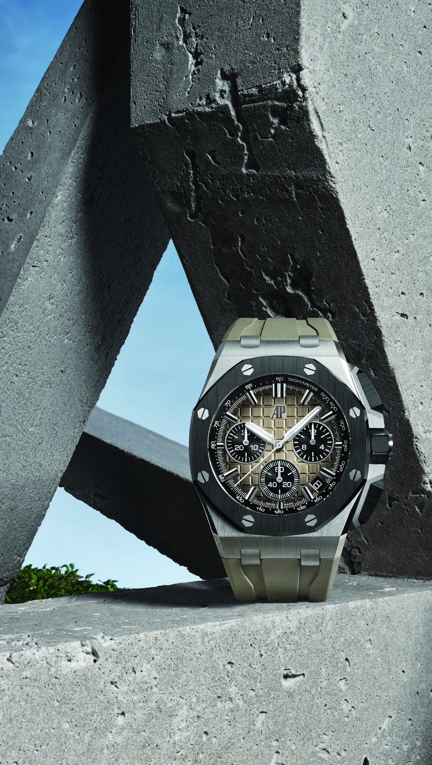 Audemars Piguet is introducing a new 43 mm model of its iconic Royal Oak Offshore, the first update since 2010. The design features pronounced polished chamfers on the case edge, curved screw-locked crown, and improved chronograph pushers, all protected by a glare-proof sapphire crystal. The watch offers a quick-release system for interchangeable rubber straps in various colors. The dial has been subtly redesigned for better legibility, with the brand’s initials now at 12 o’clock. Available in titanium, stainless steel, or 18-karat pink gold, with five color variations of the waffle-patterned Méga Tapisserie dials. Priced at $36,200, $37,500, and $56,000 respectively. The watch houses AP’s latest integrated flyback chronograph, caliber 4401, with a vertical clutch system and 70 hours of power reserve. It’s expected to draw a lot of attention and may require some patience to acquire, but the wait is likely to be worthwhile.