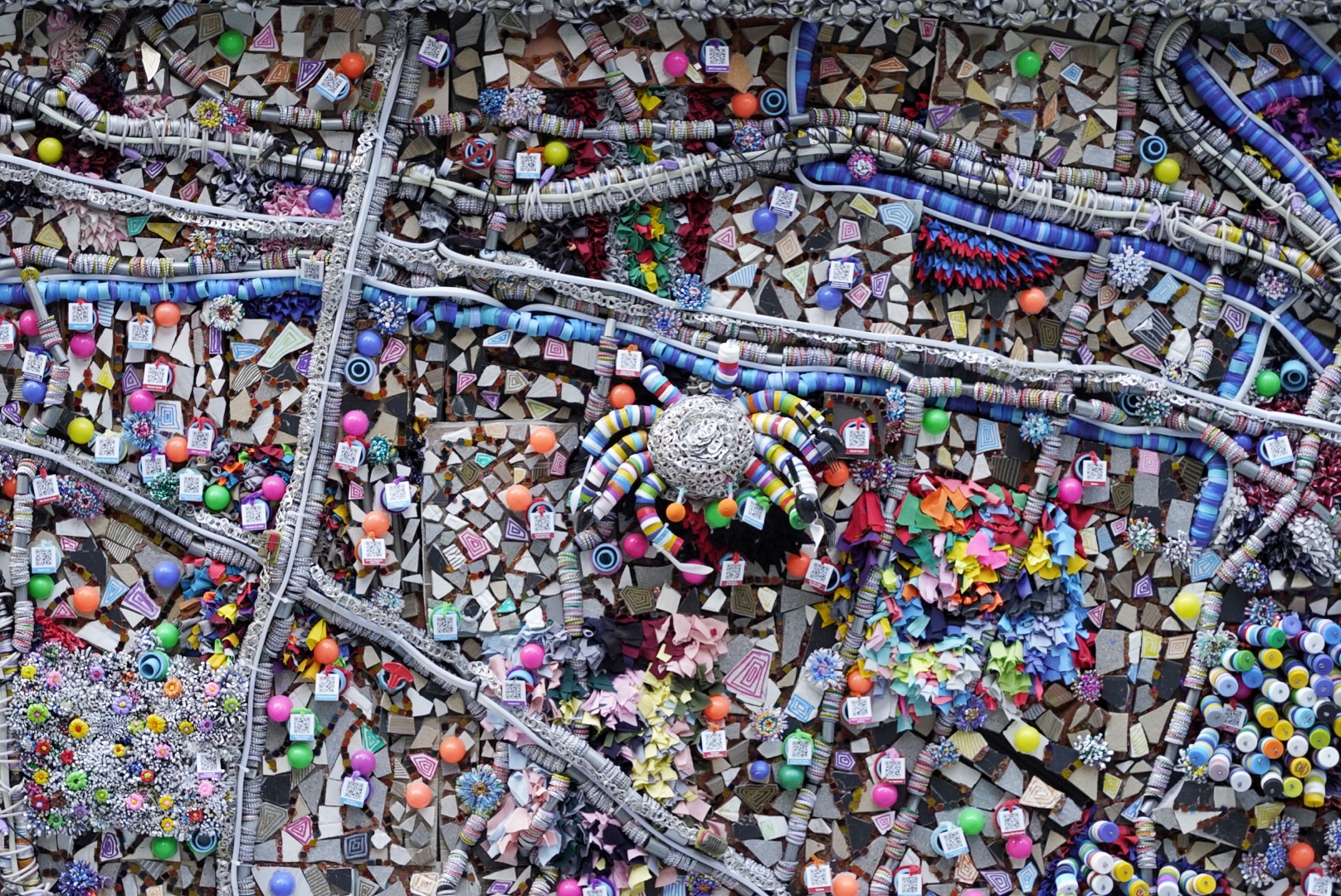 ขวดพลาสติก ถุงพลาสติก และไวนิลหลากสีสันนำมาถักทอเป็นใบไม้ ดอกไม้ และผลไม้ สร้างตื่นตาตื่นใจ
