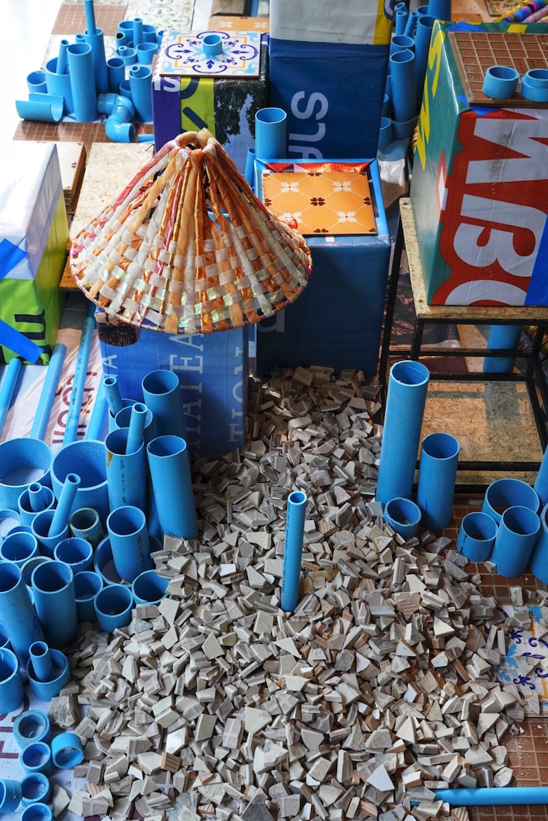 กล่องที่พันด้วยไวนิลเป็นเครื่องเตือนใจถึงผลกระทบจากการบริโภคและสัญลักษณ์ของความหวัง เมื่อสิ่งของไร้ค่าหมดประโยชน์ถูกเปลี่ยนให้เป็นส่วนหนึ่งของงานศิลปะที่มีคุณค่า “ป่าคอนกรีต ผลิใบ" เชื่อมโยงมนุษย์