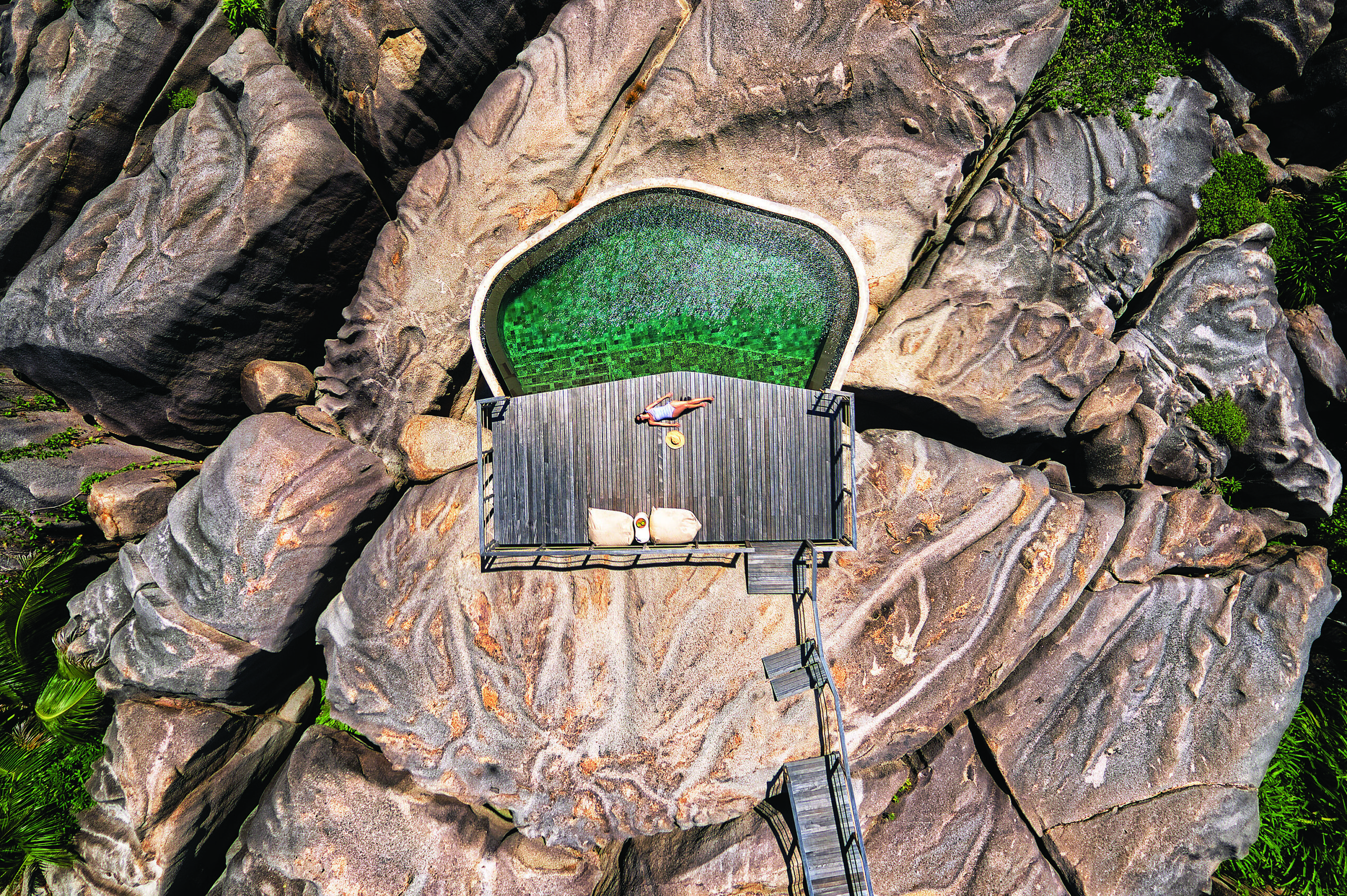 Studio RHE isn’t one to waste a good thing. For the architecture firm’s latest project—a collection of 24 residences at the Six Senses Zil Pasyon in Seychelles—the site’s giant boulders weren’t considered an obstacle to construction: They were an asset. The modern granite estates (which start at $5.5 million) lean in and out of the massive formations, with rocks forming walls, bursting through the floors like giant sculptures, and even serving as the base for the most perfect swimming pool we’ve ever seen.