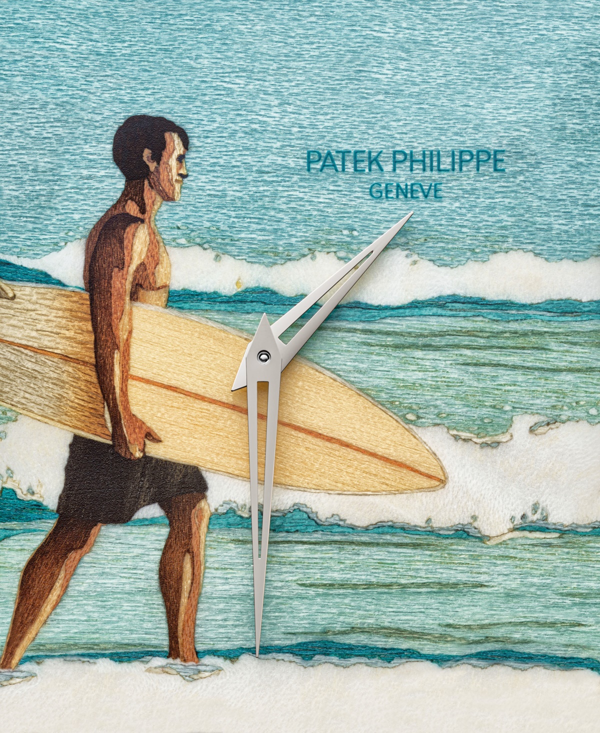 ด้านหลังของนาฬิกาพกรุ่น 995/144J-001 “Bear and Salmon" ที่มีความงดงามเหมือนจริงอย่างยิ่ง สร้างสรรค์ ด้วยการฝังประดับด้วยไม้ขนาดเล็ก อันประกอบด้วยไม้ที่บางและเล็กมากจำนวน 315 ชิ้น และการฝังชิ้นไม้บางๆ ที่ เล็กกว่านั้น 75 ชิ้น ร่วมกับการวางแผ่นไม้ที่มีสีแตกต่างกัน 38 ชนิด เพื่อให้เกิดพื้นผิวและลายเส้น