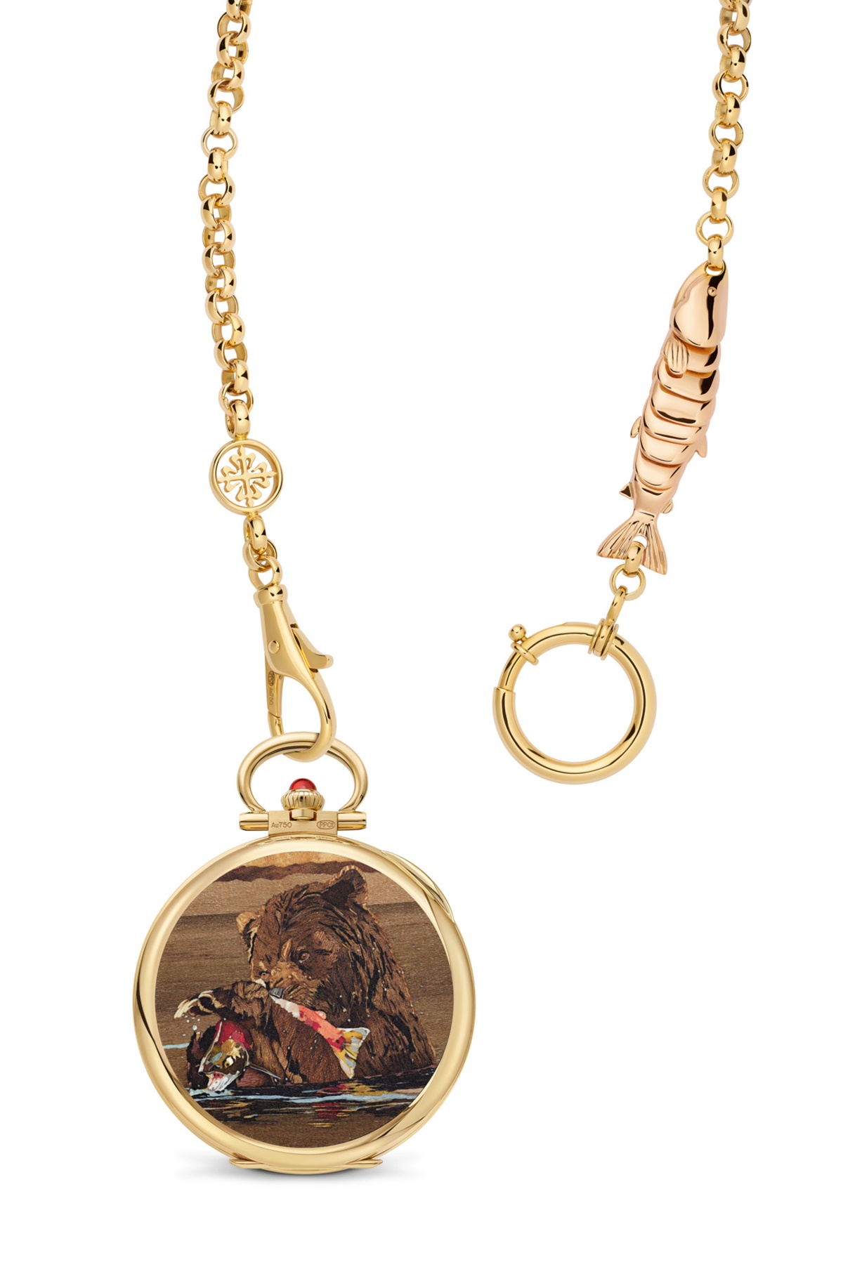ด้านหลังของนาฬิกาพกรุ่น 995/144J-001 “Bear and Salmon" ที่มีความงดงามเหมือนจริงอย่างยิ่ง สร้างสรรค์ ด้วยการฝังประดับด้วยไม้ขนาดเล็ก อันประกอบด้วยไม้ที่บางและเล็กมากจำนวน 315 ชิ้น และการฝังชิ้นไม้บางๆ ที่ เล็กกว่านั้น 75 ชิ้น ร่วมกับการวางแผ่นไม้ที่มีสีแตกต่างกัน 38 ชนิด เพื่อให้เกิดพื้นผิวและลายเส้น
