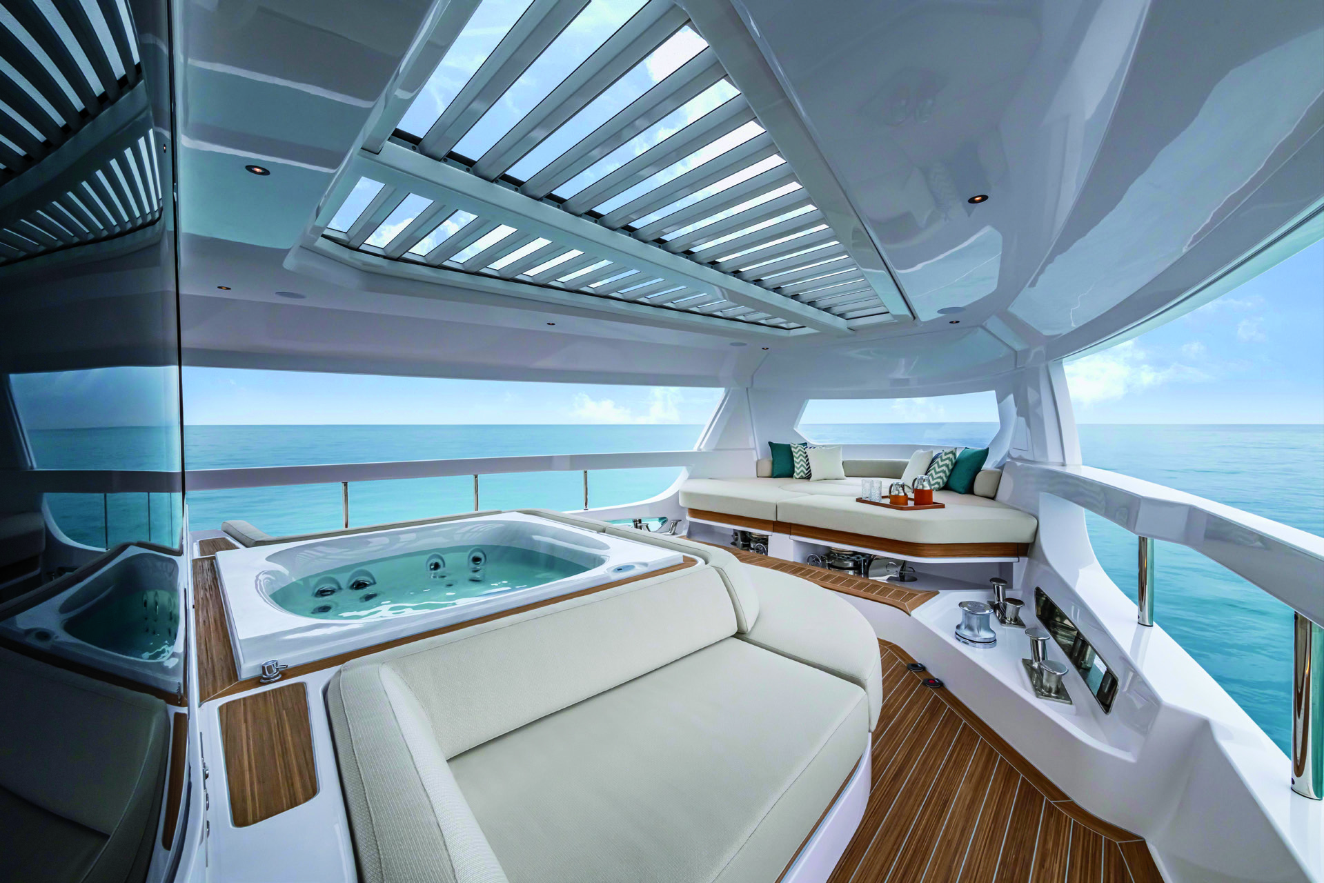 Then there’s the Ferretti Group’s Infynito 90 (above). More cruiser than explorer, the 90 features a forward enclave called the All-Season Terrace that is open on three sides but sheltered by the deck above. The space connects directly to the aft cockpit via outer passageways. Its configuration includes lounges, a sun pad, a hot tub—even the option for a bar with seating. “We designed it as an oasis to put the people living on board front and center," says exterior designer Filippo Salvetti.