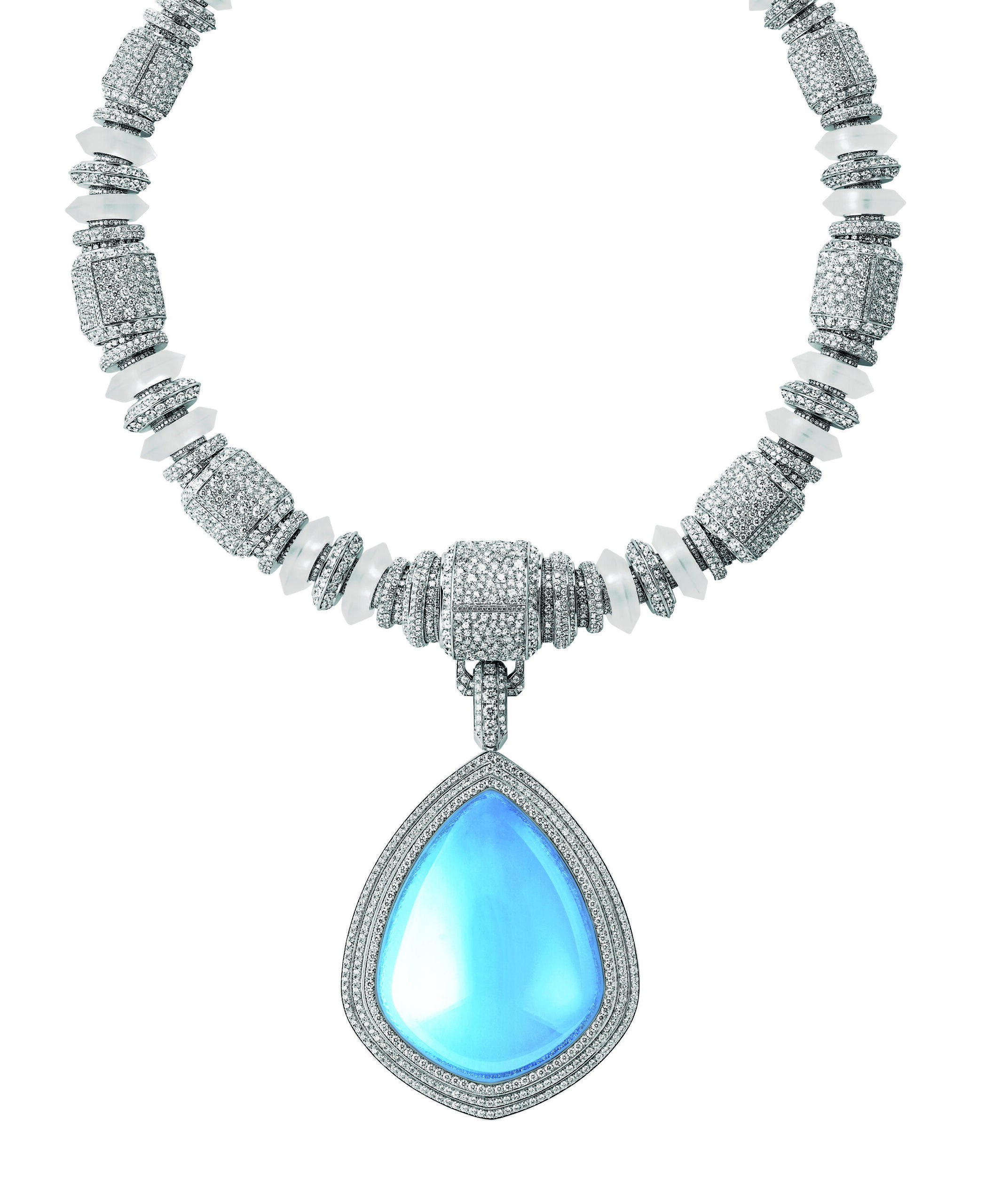 Boucheron’s new high-jewelry collection features a unique stone-like material called aerogel, never before used in jewelry, which gives off a stunning blue tint resembling the sunset. Creative director Claire Choisne collaborated with artist Ioannis Michaloudis to shape the aerogel into a six-centimeter stone, requiring 857 hours of work. Encapsulated in rock crystal and adorned with diamonds, the resulting necklace, named Goutte de Ciel (Sky Drop), is truly one of a kind. Despite its rarity making it impossible to assign a value, Choisne emphasizes that uniqueness is paramount. With this innovative approach, Boucheron continues to push the boundaries of high-jewelry design.
