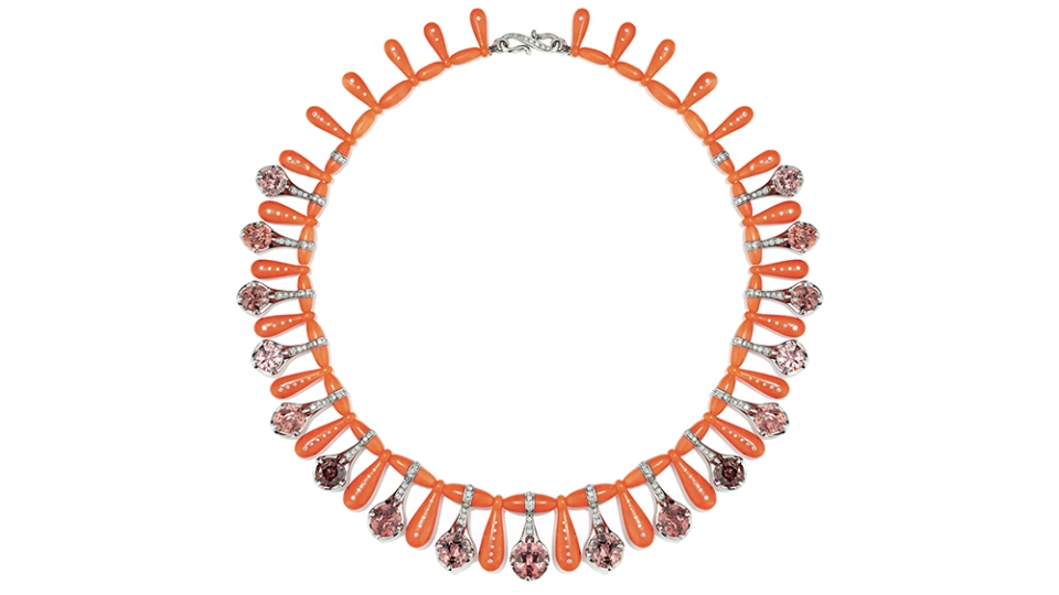 Necklace in 18-karat white gold, antique coral, natural spinel and diamonds.