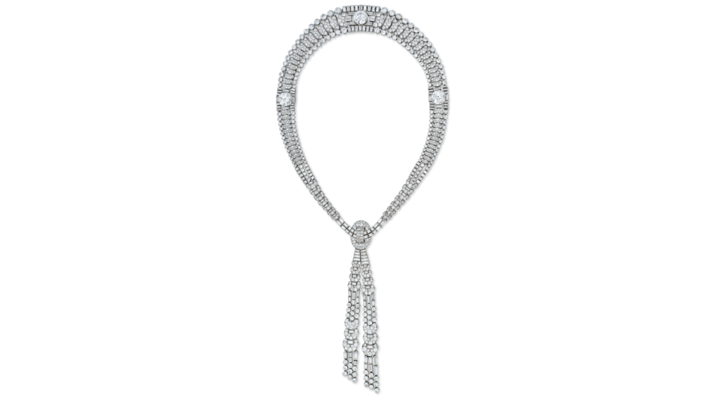 Van Cleef & Arpels tie-style diamond necklace, meant to be draped over the shoulder, made in 1929, with an elongated tassel motif ($800,000 – $1.2 million).