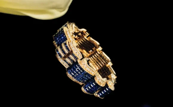 สร้อยเพชรสไตล์เนคไท จาก Van Cleef & Arpels ผลิตขึ้นในปี 1929 ออกแบบมาให้สวมคล้องไหล่ ประดับด้วยลวดลายพู่ยาว ($800,000 – $1.2 ล้าน)