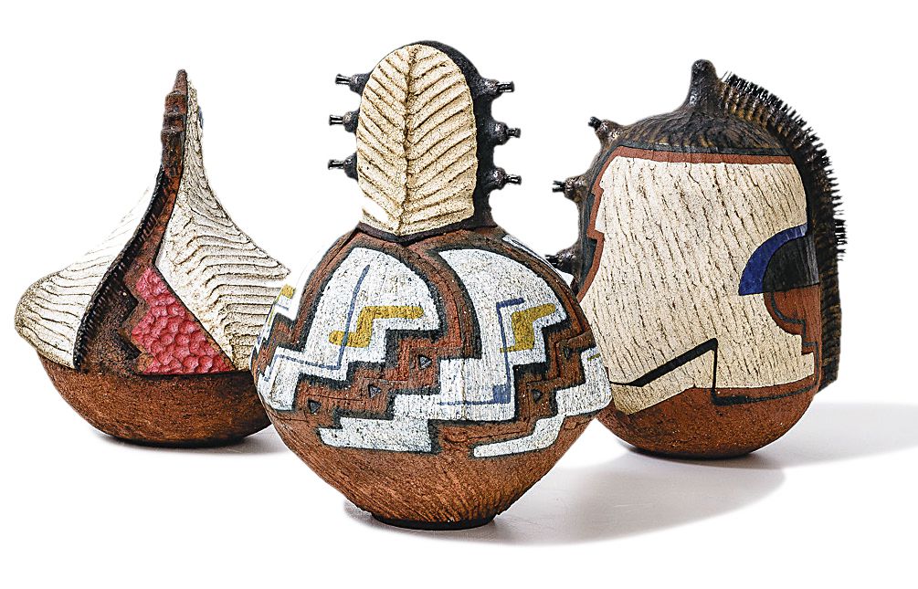 Ask Dyalvane about his ceramics and you’ll get a response that sounds more like ritual than craft. “It starts with a vision or epiphany," the South African artist says. “Then to sketches. I curate music that fits their narrative and burn impepho herbs to clear my energy." But Dyalvane’s creations are far from smoke and mirrors; they juxtapose lively shapes with deeply earthbound textures and motifs. His process helps him tap into memories—in particular of his father, a welder, returning from work with bolts, nuts and screws in hand. Such recollections coalesce in evocative vessels, bowls, sculpture and furniture, many with industrial metals pressed into earthen flesh.