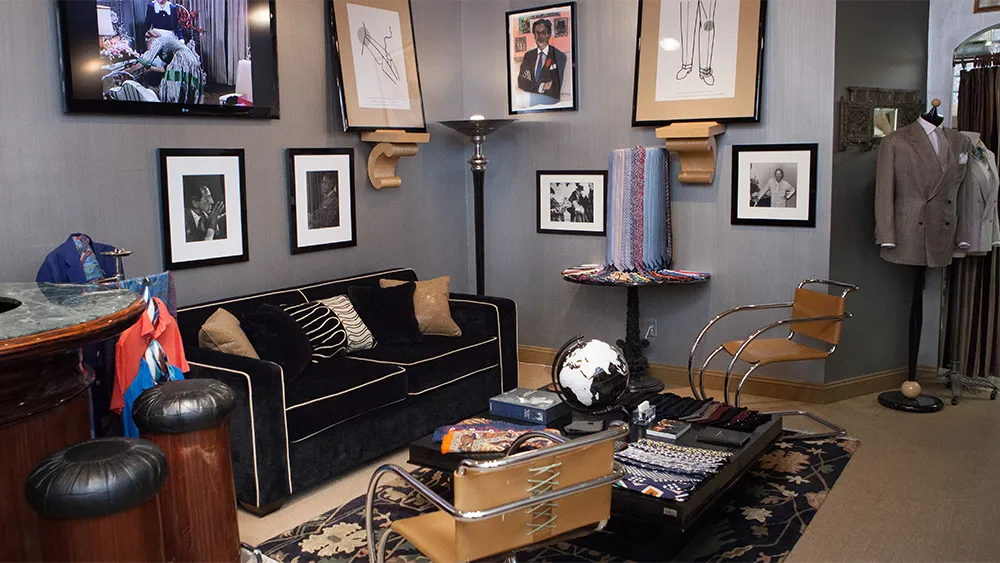 While ownership of the business passed from its titular founder to long-serving associate Jonathan Sigmon in 2020, the house style developed by Flusser over the course of four decades remains. Today, clients can procure its “updated drape" silhouette—marked by a soft, natural shoulder, a fuller chest and a trim waist—through both custom and made-to-measure. Its custom offering is largely handmade in New York City, while made-to-measure garments are finished in its New York City workshop following two fittings. While it may always be most readily associated with Wall Street antagonist Gordon Gekko—who Flusser famously outfitted—the business also offers full bespoke and made-to-measure for women.