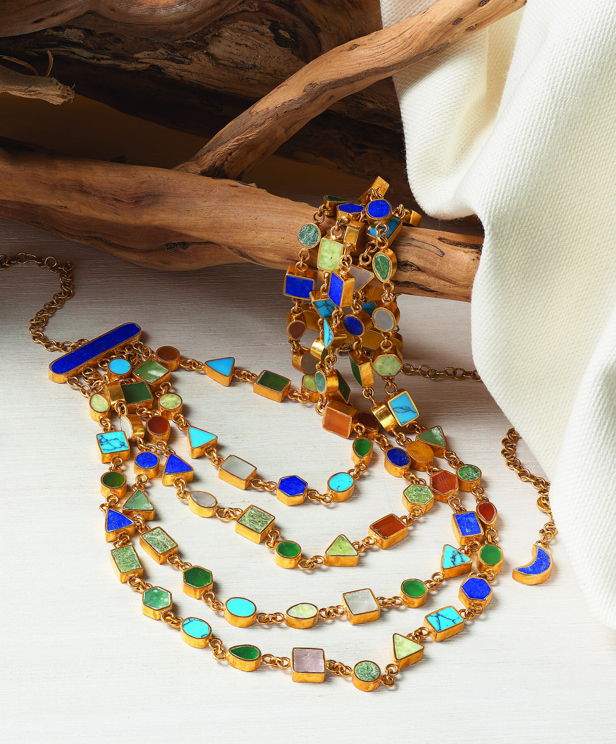 These Pippa Small (pippasmall .com) designs were made by women and men in Afghanistan as part of the Turquoise Mountain project: gold-vermeil and hand-painted ring and earrings, and the gold-vermeil Hamsa multistrand necklace with lapis, turquoise, jasper, agate, and chrysocholla.
