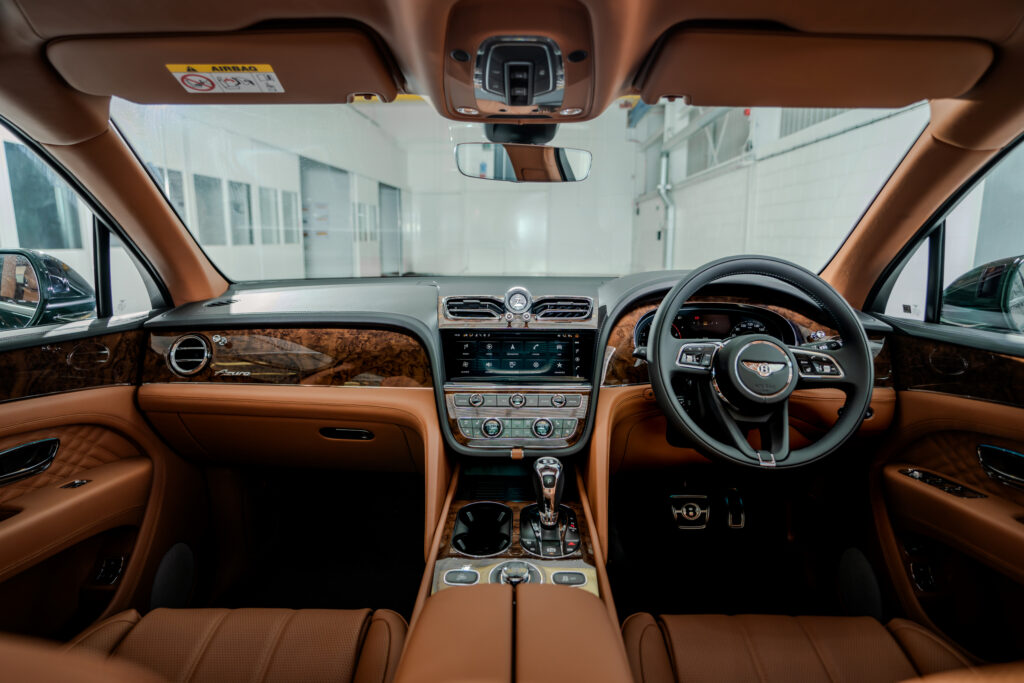 ภายในห้องโดยสารมาด้วยรูปแบบ 4+1 ที่ถือเป็นการนำเสนอการตีความแบบร่วมสมัยในแบบคลาสสิกของเบนท์ลีย์ พร้อมการตกแต่งด้วยหนังเฉดสีน้ำตาล Saddle โดยมีการเลือกใช้หนังเฉดสีดำ Beluga บนขอบประตูห้องโดยสาร แผงคอนโซล และพวงมาลัย พร้อมด้วยโทนสีที่อบอุ่นของวีเนียร์แบบ Burr Walnut ที่ใช้กับแผงหน้าปัด ประตูห้องโดยสาร และโต๊ะพับแบบอัตโนมัติบริเวณหลังเบาะโดยสารคู่หน้าที่จะเข้าคู่กับเฉดสีของหนัง