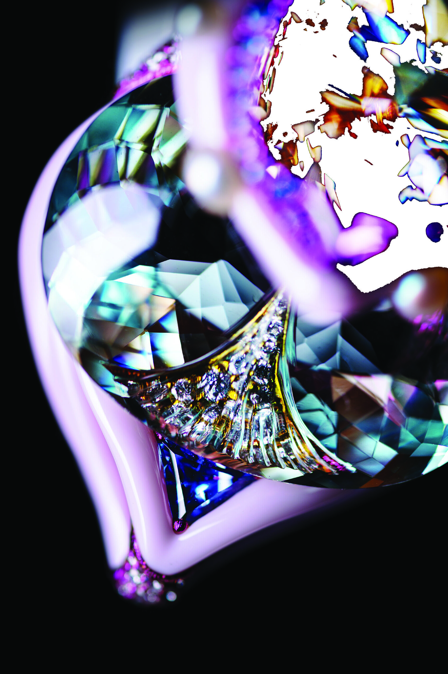 The latest innovation from Hong Kong–based jeweler Wallace Chan’s workshop is a light and lustrous new porcelain—five times stronger than steel and essentially shatterproof. Seven years in the making, the material gives the new Double Star ring—with its 38.9-carat aquamarine, diamonds, sapphires, titanium, and pink-tinged porcelain—volume without heft.