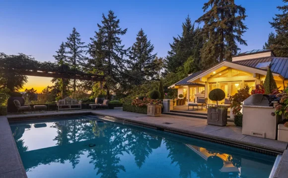 Upstairs, the second floor is largely taken up by a windowed dining room, which can be converted into a second bedroom, while oenophiles can keep their wine in the adjacent walk-in wine storage. One more set of stairs up and you’ll find the primary bedroom, with a gas fireplace and east and west exposures. The primary bath includes a sunken soaking tub and is decked out with Thassos marble.