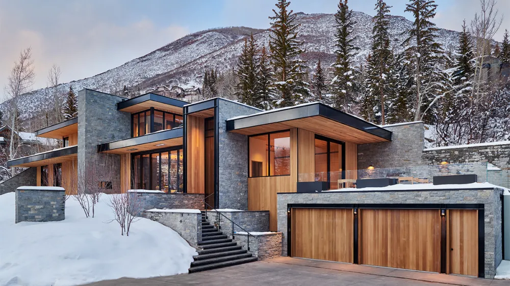 Wood cladding and stacked stone volumes comprise the home’s exterior, evoking a warm feeling, while floor-to-ceiling windows frame magnificent natural vistas. Through the double-height entrance, a dark stone wall contrasts against the living room’s beige and white color palette. A monolithic fireplace trimmed in great sheets of polished marble keeps things toasty in here while the epic landscape views are just beyond sliding glass doors that open onto a covered patio.