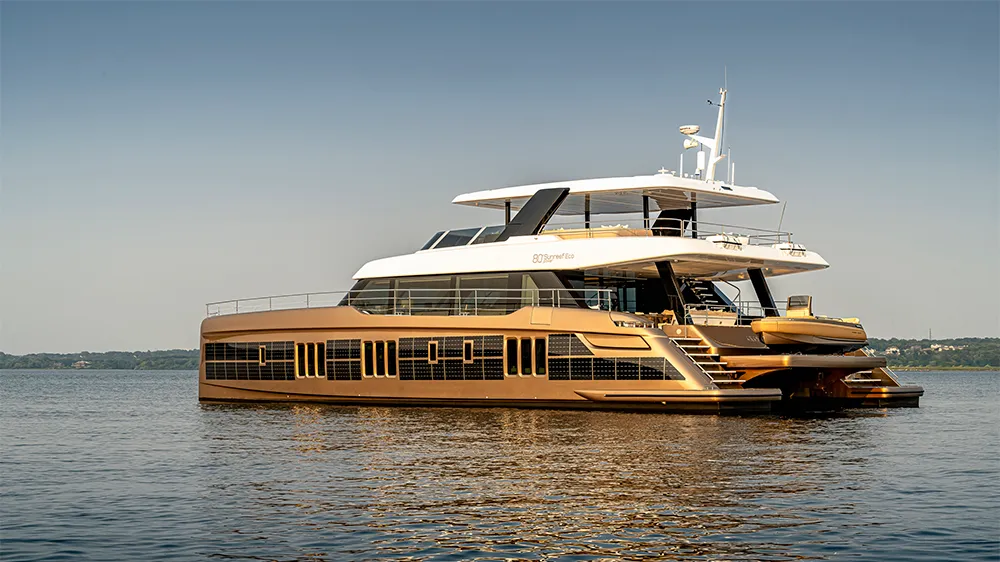 ความก้าวหน้าในการออกแบบเรือยนต์ไฟฟ้า เรือ 80 Sunreef Power Eco มีขนาด 80 x 39 ฟุต สร้างภายในที่โปร่งสบาย ด้วยพื้นที่ใช้สอยเท่ากับรุ่น สูง 100 ฟุต หลายรุ่น แทนที่จะต้องเสียบปลั๊กที่ไหนสักแห่งเพื่อชาร์จไฟ 80 Eco แต่สามารถใช้แผงโซลาร์เซลล์ที่ทนทานต่อแรงกระแทกภายในตัวเรือได้ โครงสร้างส่วนบน และหลังคาแข็งทุกที่ที่ดูดซับแสงแดด ซึ่งจะช่วยเติมเต็มแบตเตอรีแบตเตอรีที่มีขนาด 330 กิโลวัตต์ชั่วโมง ที่เชื่อมต่อกับมอเตอร์คู่ขนาด 180 กิโลวัตต์ ห้องโดยสารทั้งสี่ยังมีระบบการจัดการพลังงานอัจฉริยะเพื่อตรวจสอบคุณสมบัติต่างๆ เช่น เครื่องปรับอากาศแบบใช้พลังงานต่ำ