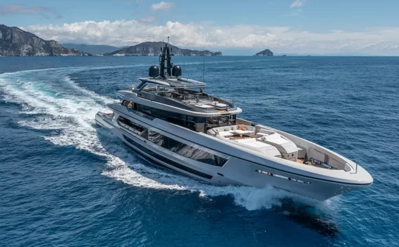 A legitimate breakthrough in all-electric motoryacht design, the 80 Sunreef Power Eco’s 80-foot by 39-foot dimensions create an airy interior with the usable space of many 100-foot models. Instead of needing to plug in somewhere to recharge, the 80 Eco relies on thin shock-resistant solar panels within the hulls, superstructure, and hardtop anywhere absorbing sunlight that replenish the 330 kWh battery banks connected to twin 180 kw motors. The four-cabin cat also has a smart energy-management system to monitor features such as its low-draw air-conditioning.