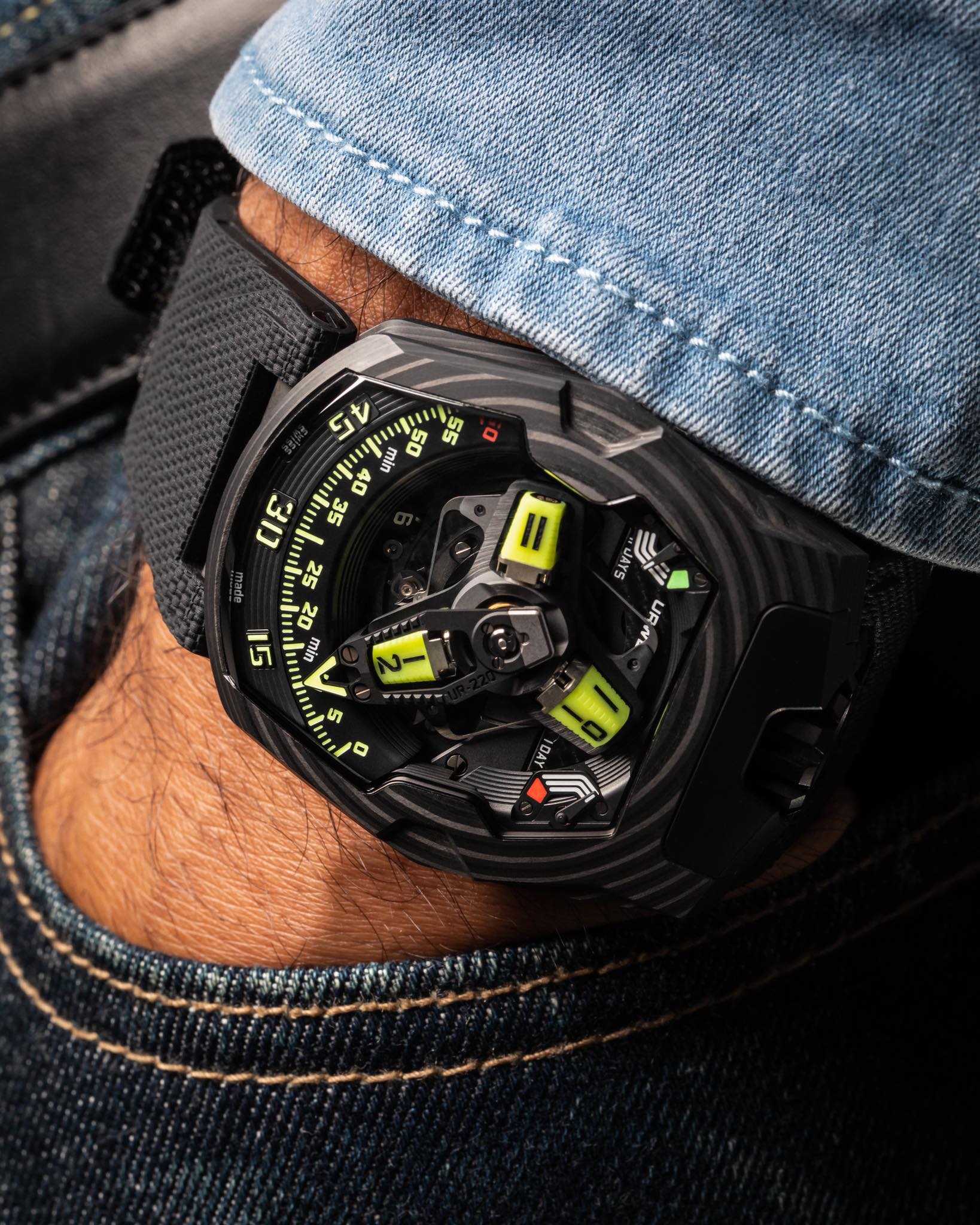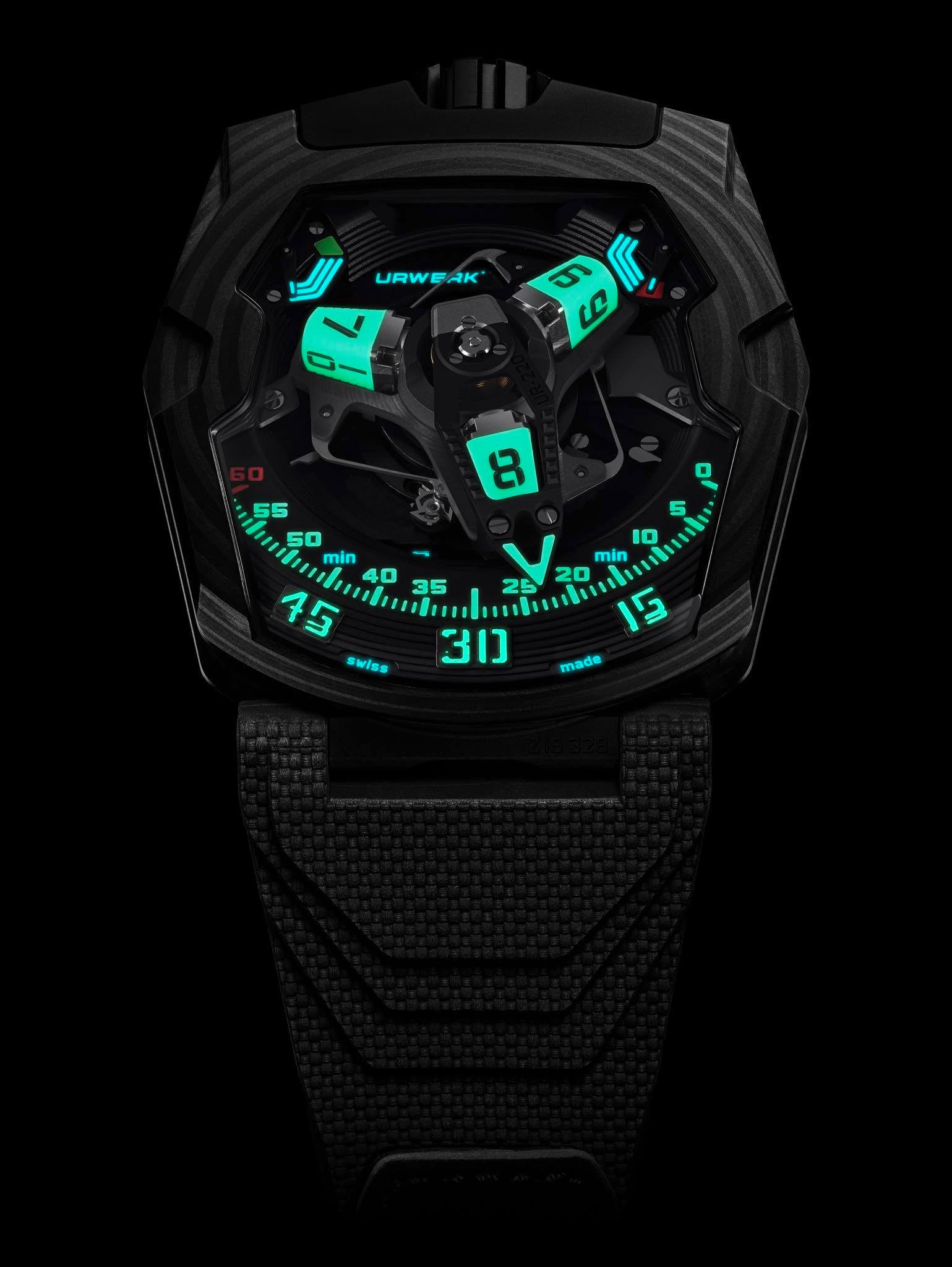 Stealth spaceship by day, luminescent installation by night, the UR-220 SL Asimov is the third variation of the 220 collection. Under the impetus of designer and URWERK co-founder Martin Frei, the model has undergone subtle changes in materials, colours, finishes and aesthetic characteristics. Against a predominantly black carbon backdrop, the UR-220 revisits a fascinating play on contrasts and luminosity.