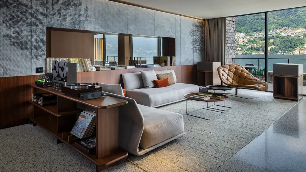 Brought to life by designer Patricia Urquiola, the stylish interior is also focused on sound. A 50-foot wall of custom jacquard fabric, for example, enhances the acoustics and creates a striking focal point. The suite is adorned with Molteni sofas, Gio Ponti Leggera chairs, and a bespoke stone dining table around which guests can gather and listen to vinyl. It is also equipped with floor-to-ceiling glass windows and a private deck with direct lake access, meaning nature is literally on your doorstep.