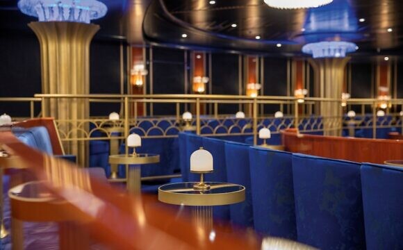 From the bar, views of the spiral staircases extend back into the Starlight Atrium on both port and starboard sides. The walls, clad in a limestone texture, are adorned with sconces designed to resemble jewellery, adding a touch of glamour.