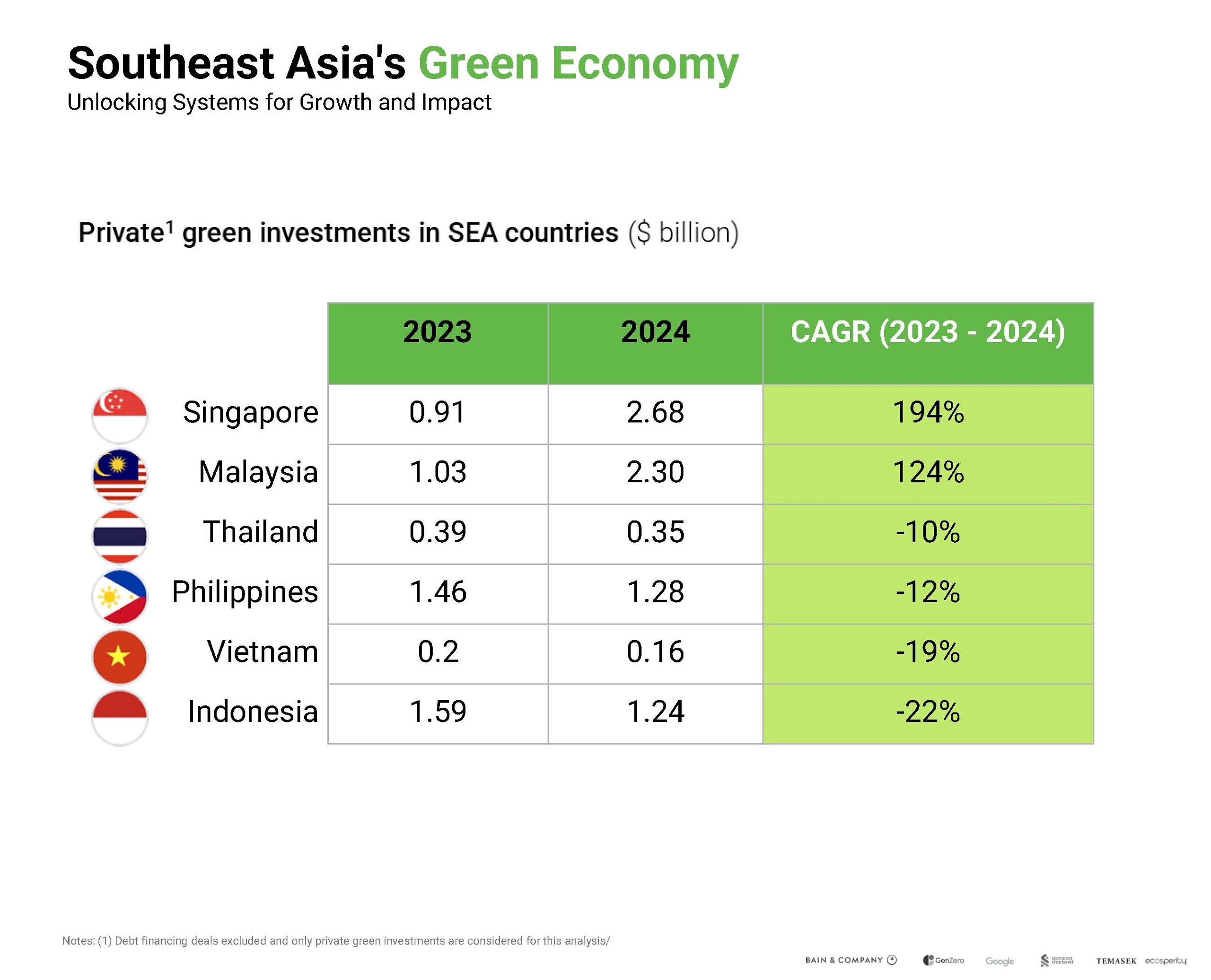 - Private green investments totalled USD 355 million in 2024, accounting for ~4% of SEA-6 total. Green cement (~60% of overall investment) and solar (e.g., solar rooftop PV systems) attracted most investments in 2024.