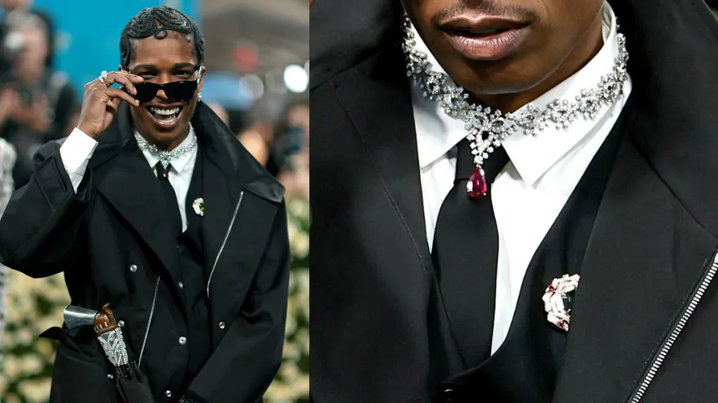 Another co-chair of the event, the Harlem-born rapper paired a custom tuxedo and raincoat from his own brand Awge with strategic jewels. There was the requisite diamond brooch in pink gold with a cushion-cut peridot; a diamond necklace set with a 12.29 pear-cut ruby surrounded by 22 round diamonds (D-F VVS totaling 9.30 carats) and pavé-set diamonds (D-F IF-VVS totaling 37.16 carats) worn over his tie; a pair of diamond cluster earrings; and a slew of rings, including a Serpenti in diamonds and gold with two emerald eyes, all of which were from Bulgari. (He also wore an Octo Finissimo watch, but unfortunately, you couldn’t see it.) Another major focal point of the look? A custom umbrella by Briony Raymond with a diamond-encrusted handle and top … shaped like a gun.