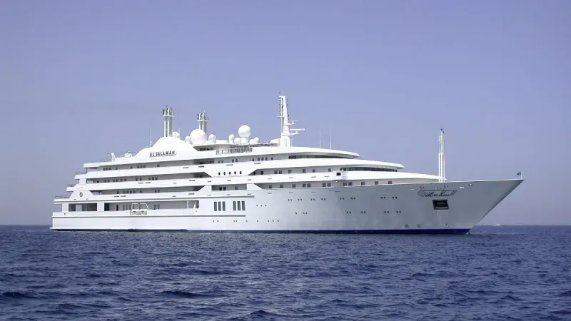 At the time of its construction in 1999, 456-foot Al Salamah was the third-largest yacht in the world. The build began at German yard HDW in Kiel, but was completed by Lürssen in Bremen, the only yacht builder at the time capable of meeting the owner’s demanding timeline. Al Salamah was commissioned by the late Saudi Arabian crown prince, Prince Sultan bin Abdul Aziz. Estimated to be worth around $200 million and accommodating 36 guests, the ample amenities include a cinema, a fully equipped onboard hospital, two full-time beauticians, a business center, and a spa.