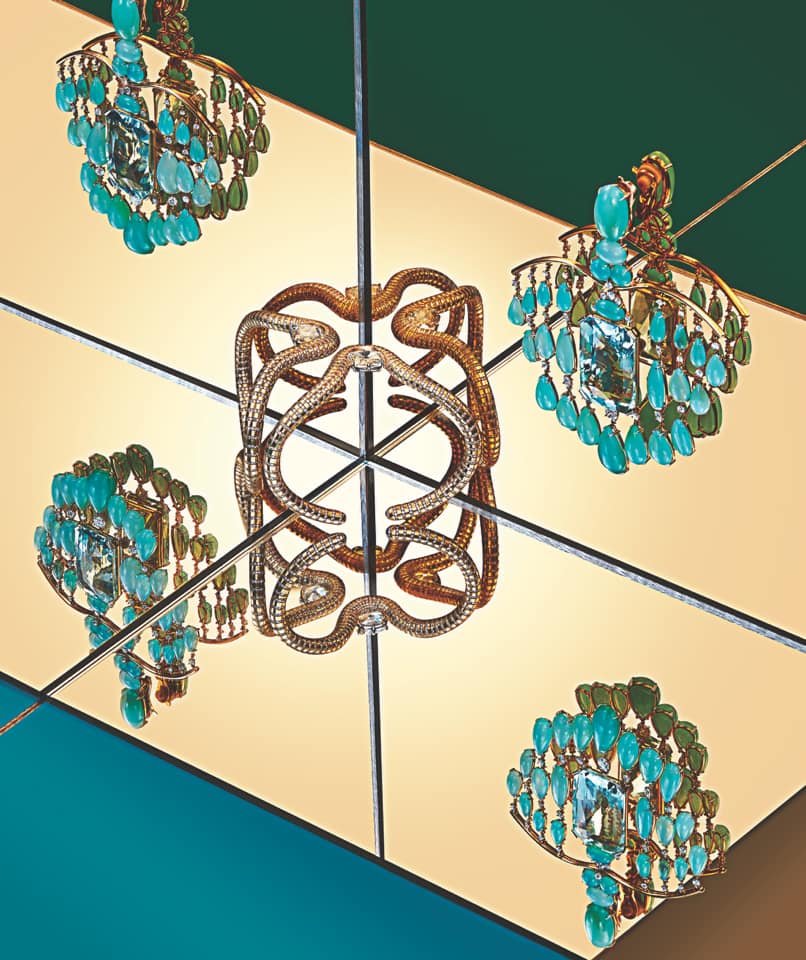 Alessandro Sabbatini is taking the seriousness out of high jewelry. The 31-year-old jeweler’s Sabba collection plays with scale, color and movement in designs such as these oversize chandelier earrings with 106 carats of aquamarines plus Peruvian opals. It’s easy to see why his pieces, including a curvaceous gold bangle with what appears to be a floating 4-carat diamond, appeal to contemporary art collectors.