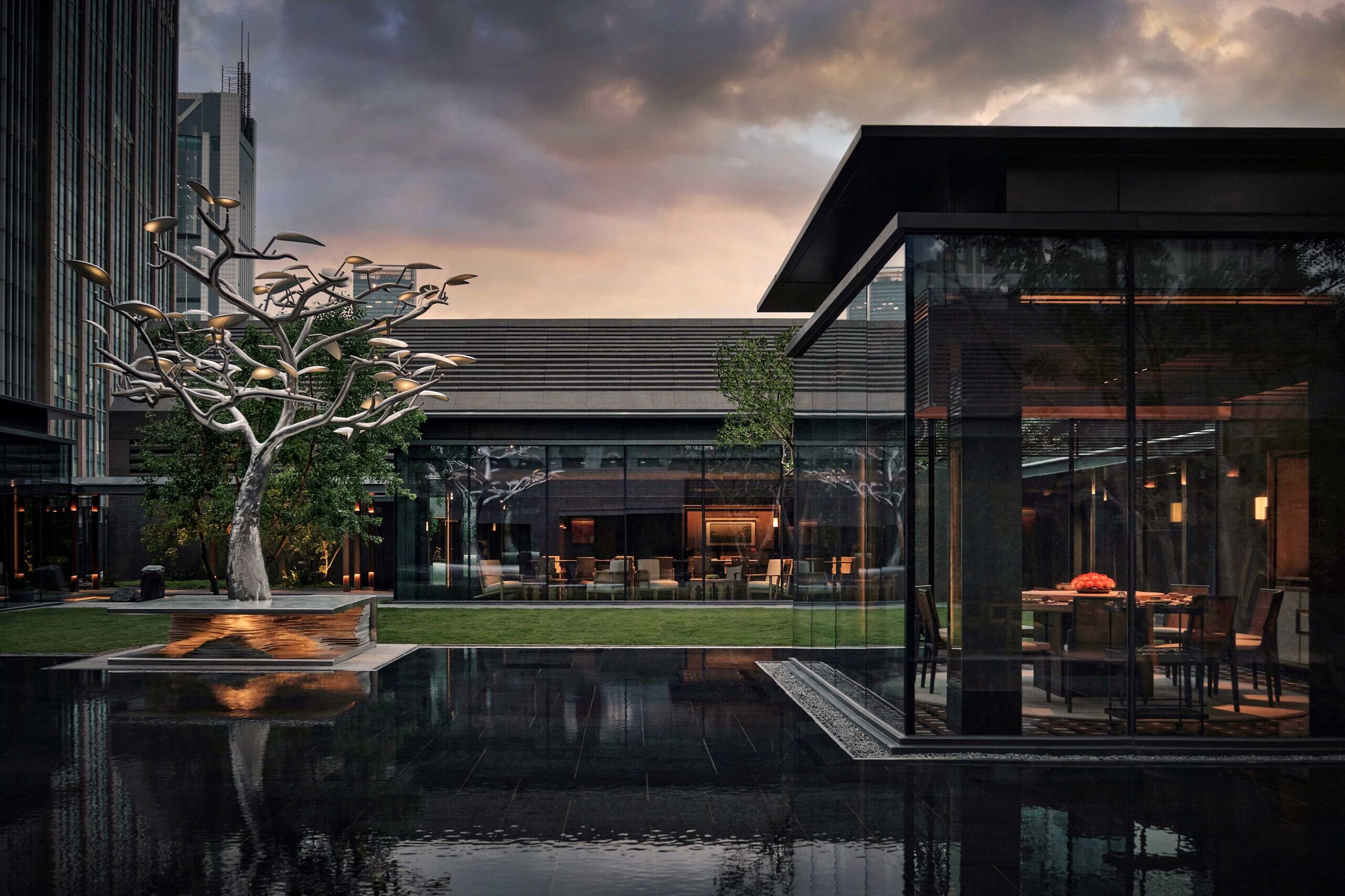 Dominating the central courtyard is the striking ‘Gathering’ tree, a 17-foot-high art installation created by cutting-edge artist Oscar Wang. Inspired by the five senses and the five elements, the tree’s handmade ceramic lights become increasingly prominent under the night sky. Seamlessly blending with the environment, and reinforcing Shanghai’s contrasting character, the artwork complements the shimmering Shanghai skyline while drawing attention to the surrounding greenery.