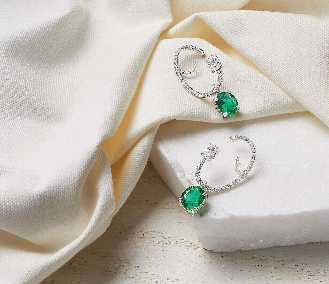 ต่างหู Coco ทำด้วยมรกตโมซัมบิกจาก Gemfields และต่างหู Teresa ทำด้วยแทนซาไนต์ที่มาจากแหล่งผลิตที่หน้าเชื่อถือ ทั้งสองชิ้นประดับด้วยทองคำและเพชรแท้ 18 กะรัต