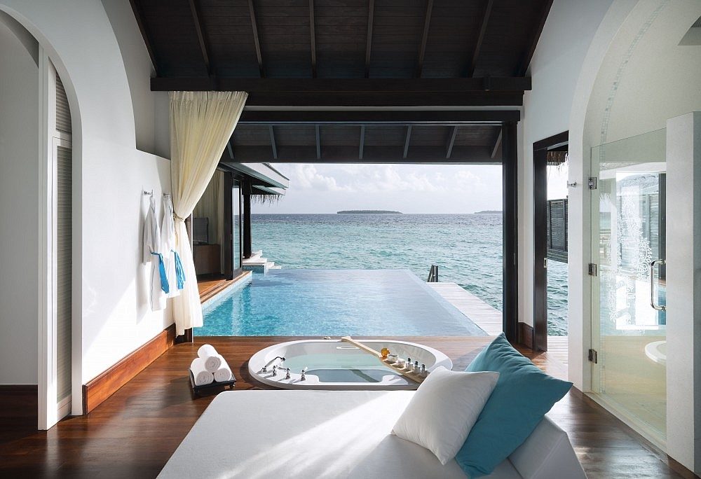 With 79 villas and residences, the luxurious resort is accessible only by a 35-minute seaplane flight from the Ibrahim Nasir International Airport. Throughout, Kihavah is accentuated with understated teakwood furniture, ocean-view beds, expansive bathrooms, mosaic-tiled pools, and 360-degree views of the white, sandy beach.