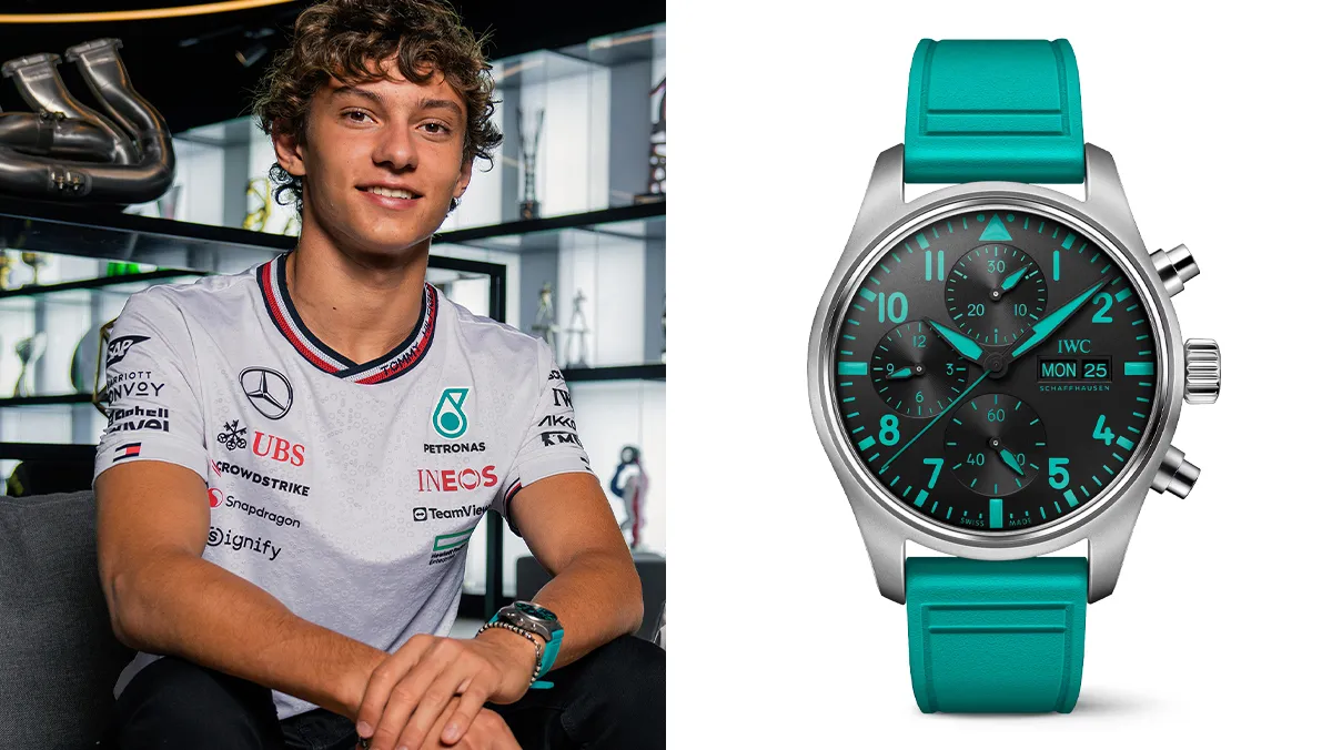 Andrea Kimi Antonelli เพิ่งเข้าร่วมกับทีม Mercedes-AMG Petronas Formula 1 และได้ปรับเปลี่ยนรถและชีวิตประจำวันของเขาแล้ว นักขับชาวอิตาลีได้อวดโฉม IWC Pilot’s Watch Chronograph 41 (Ref. IW388108) ที่ออกแบบมาเพื่อเป็นเกียรติแก่ชุดแข่งรถดาวสามแฉก (ผู้ผลิตนาฬิกาชาวสวิตเซอร์แลนด์ได้สร้างโมเดลหลายรุ่นสำหรับ Mercedes ตั้งแต่ปี 2004) นาฬิกาแสดงสีของทีมได้อย่างเหมาะสม โดยมีตัวเรือนไทเทเนียมขนาด 41 มม. หน้าปัดสีดำ และสายยางสีเขียว สีเขียวนี้ยังปรากฏบนจอแสดงวันที่และวัน (สิ่งเป็นรายละเอียดที่ไม่ใช่ทุกบริษัทนาฬิกาจะใส่ใจได้อย่างถูกต้อง) เช่นเดียวกับเคาน์เตอร์โครโนกราฟสามตัว และเครื่องหมายชั่วโมงและนาที เราอาจพูดได้ว่ามัน “tealed out” นาฬิกาที่มีราคา 8,350 ดอลลาร์สหรัฐเป็นวิธีที่ดีในการแสดงความจงรักภักดีต่อ Mercedes