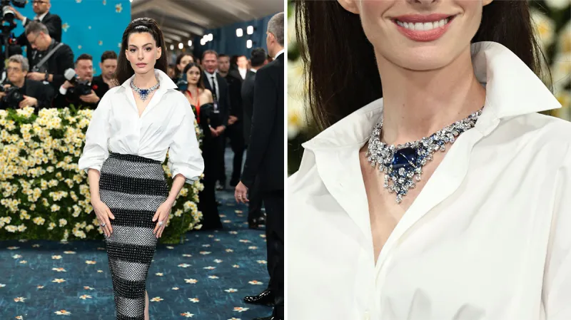 With a Carolina Herrera white shirt and striped skirt inspired by the archives of legendary editor and OG dandy André Leon Talley, a major statement necklace was the only option for a finishing touch. The actress wore a Bulgari Cosmic Vault high jewelry necklace with a 123.35-carat sugarloaf sapphire center stone to complete her look.