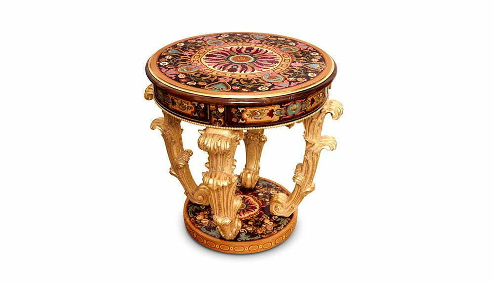 In this collection, the company has turned eastwards for its inspiration to produce a three-piece, Oriental-style set of furniture. A coffee table adorned with elaborate, hand-carved legs and gold-leaf finish is complemented by a similarly colourful chest of drawers and a circular side table with a rotary top, which opens to reveal a set of drawers.