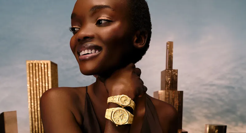 Well, ladies, we’ve been asking for it, and here it is: smaller versions of watches that are classically men’s. The RO Mini is a 23 mm interpretation of the mighty icon. It was inspired by a 20mm mini Royal Oak launched in 1997, just as the watch industry was entering a renaissance of sorts. The new one is quartz, which has been trending lately in luxury watches, particularly gold dress watches (presumably to counteract the skyrocketing price of the precious metal). The RO Mini is in frosted 18-karat gold only—white, yellow, or rose—on a bracelet. Each has a petite tapisserie dial matching the gold case and bracelet. $34,400