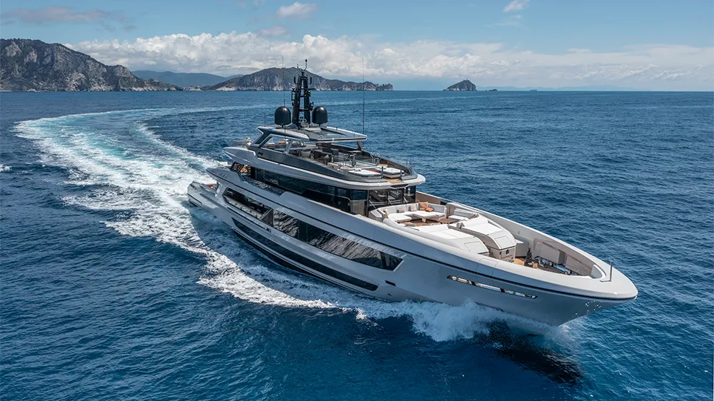 After stepping aboard Baglietto’s newest T52 at its yard in La Spezia, Italy, we were instantly taken with the 1,400-square-foot flybridge, reportedly the largest on any 171-footer, connected to the foredeck lounge via a retractable staircase. Also noteworthy: five generously sized social areas across the exterior of the Francesco Paszkowski design. Codesigner Margherita Casprini’s vision for the interior, meanwhile, matches dark-oak floors with a single wood and stone teak and Botticino marble for a pared-back aesthetic that’s highlighted by stainless- steel accents and custom furniture.