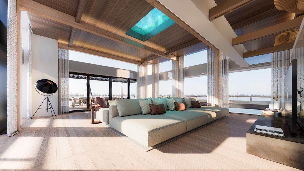 B.Yond 57M is designed to guarantee a range of experiences on long cruises. This model has three stern configurations: the Beach version with a generous outdoor area and pool, the Air version, with a touch&go helipad for a limitless cruising experience and the possibility of transforming this space into a veranda, and the Water version designed to stow marine exploration equipment. The extensive glazing on this 57-meter yacht lets in the sunlight, making it possible to use wood with a carbon black finish that translates into more luminous views of the water.
