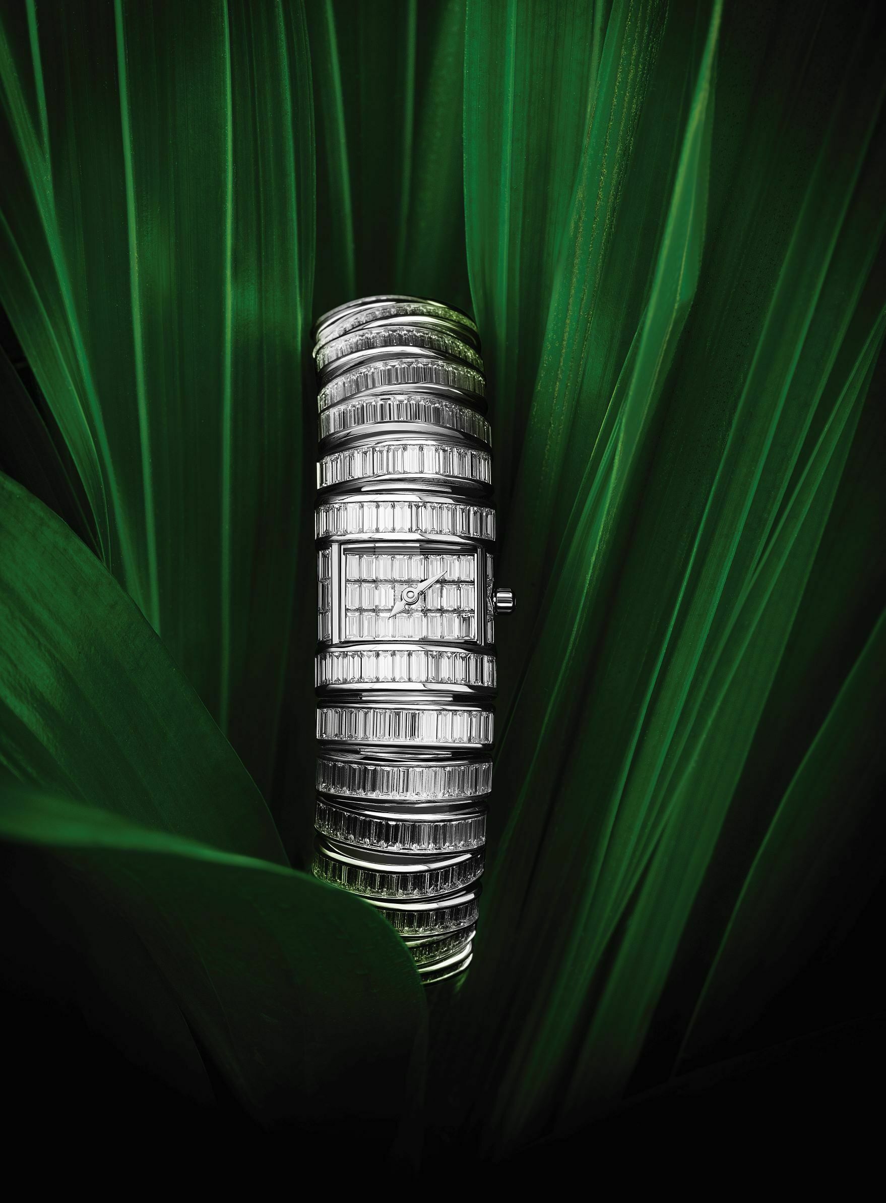 Parmigiani Fleurier proves once again that it can deliver much more than the time with its show-stopping Boa Prinzi. The renowned Swiss watchmaker and master of high jewelry enlisted expert artisans to set 28.5 carats of baguette diamonds seamlessly in the watch’s 18-karat- white-gold bracelet, which is constructed of connecting links on a concealed hinge system. The result is a flexible diamond-laden design that appears remarkably fluid and modern.