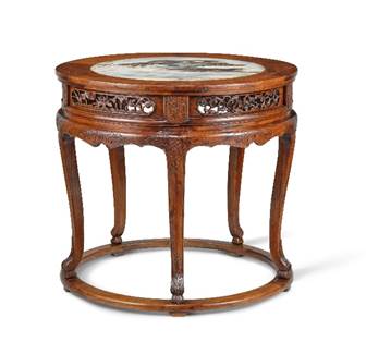 The leading lot is a Magnificent and Extremely Rare Marble-Inset Huanghuali Five-Legged High Waist Round Ji Table, Late 16th to early 17th century (estimate upon request). Round ji tables are among the rarest examples of classic Chinese furniture, and this exquisite piece stands out for its remarkable craftsmanship. Featuring a stunning dalishi marble top, the elegantly carved beaded-edged uprights and intricate openwork panels showcase floral and leaf motifs. The deep curvilinear aprons and gracefully flared legs culminate in leaf-shaped feet, all crafted from a single piece of wood. With only one comparable example known in the de Santos Collection, this table is not just a functional piece but also a rare masterpiece of artistry and design.
